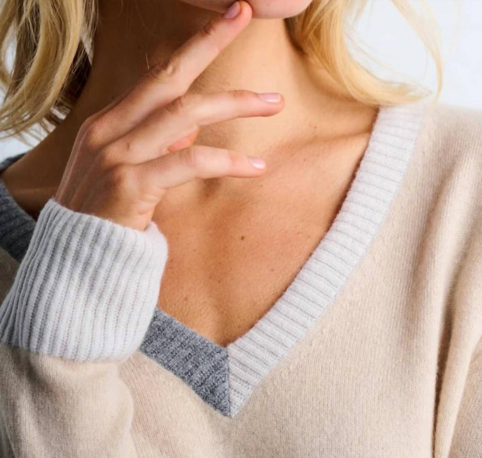 Wear this v-neck sweater with your favorite denim for the perfect fall look. Introducing the Color Wheel Sweater by LISA TODD, a stylish and sophisticated piece perfect for your minimalist wardrobe. Crafted from 100% Cashmere, this long-sleeve sweater features a relaxed fit with drop shoulders and refined ribbed finishes at the cuffs and bottom hem. It showcases an artful colorblock design at the cuffs and back, with a contrast V-neck that adds a bold twist to its solid Latte Caramel hue. Closure: Pull on. Ideal for Spring and Thanksgiving occasions, this piece effortlessly elevates your holiday party ensemble. Model is 5’9” and wears size small.