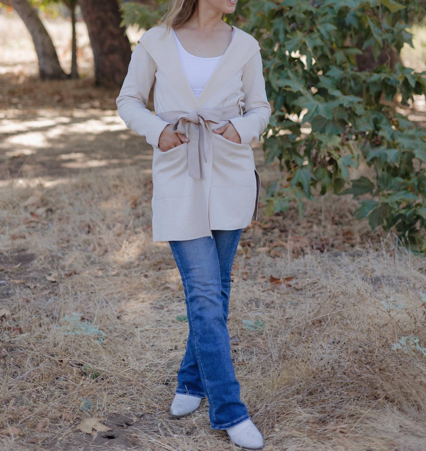 A jacket so versatile you can literally wear it with anything. The Leah Hooded Coat by Hem & Thread is a must-have for your fall travels, featuring a solid beige color and lightweight faux suede material. This casual jacket includes long sleeves and a functional, removable belt for versatile styling. With a convenient tie closure and practical pockets, this hooded coat is both stylish and practical. Jessie is wearing a size Small, making it an ideal piece for your 90s fashion-themed Thanksgiving ensemble.