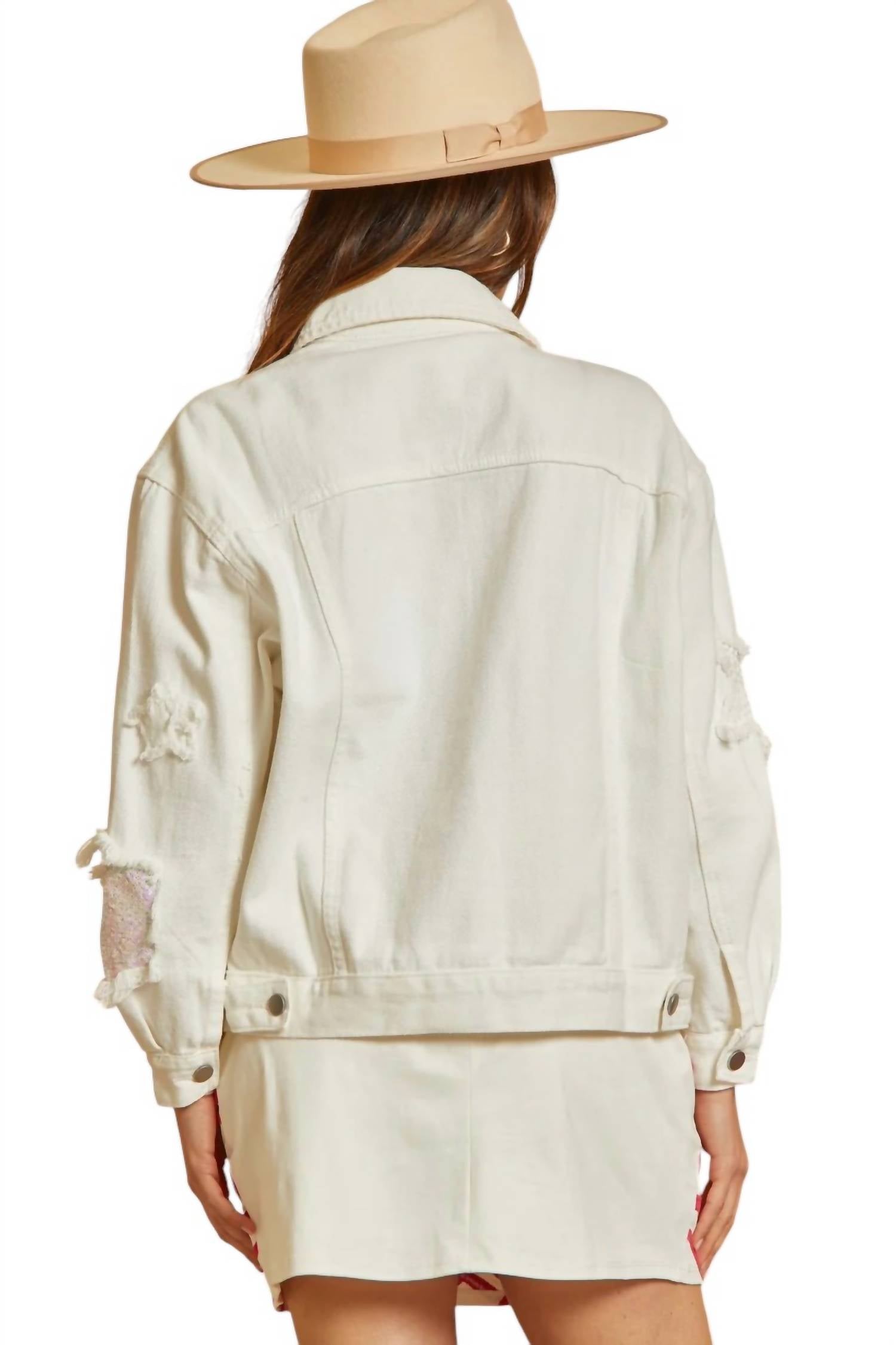 This washed denim jacket features sequin star patch sleeves, an oversized fit, and a collared design. It has long sleeves, pockets, and a button closure. Made from 100% cotton.