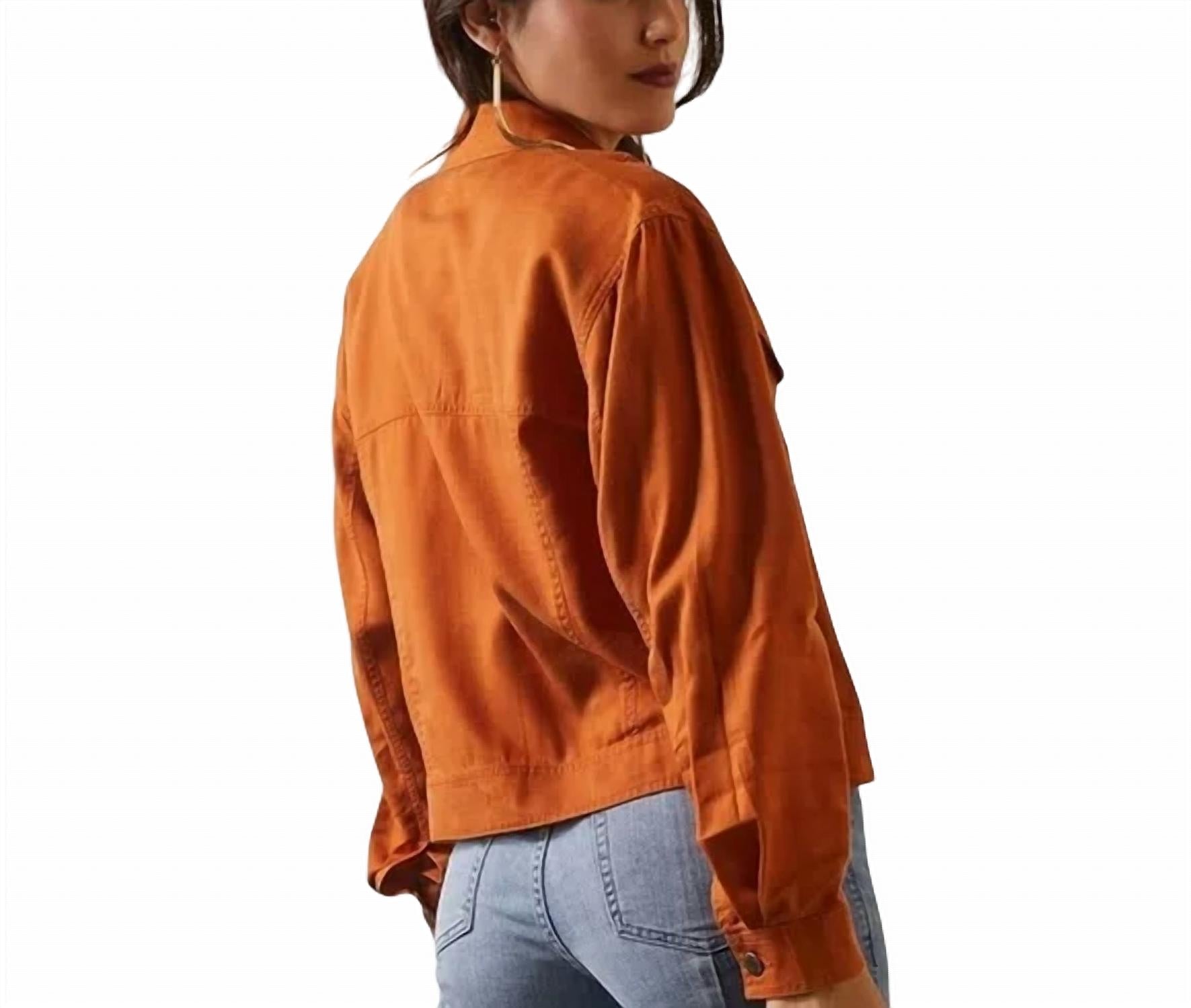 The Cactus Trucker Jacket features long sleeves, button-flap chest pockets, and hand pockets. It also has a spread collar and a button-down front. It is made of 100% lyocell.