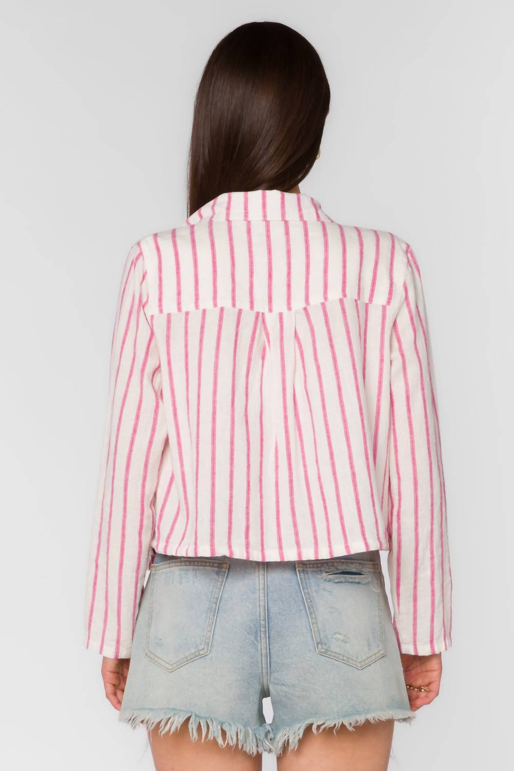 A casual yet cool jacket that every closset needs. Elevate your wardrobe with the Velvet Heart Seren Jacket in a striking fuchsia stripe, blending style and functionality. This chic casual jacket features long sleeves and a button closure, ideal for laid-back days. Made of a breathable linen blend (55% Linen 45% Viscose), it's crafted for comfort with roomy pockets and a cropped cut. Imported and designed for easy care, simply hand wash with cold water. Model is 5'10" and wearing a size S.