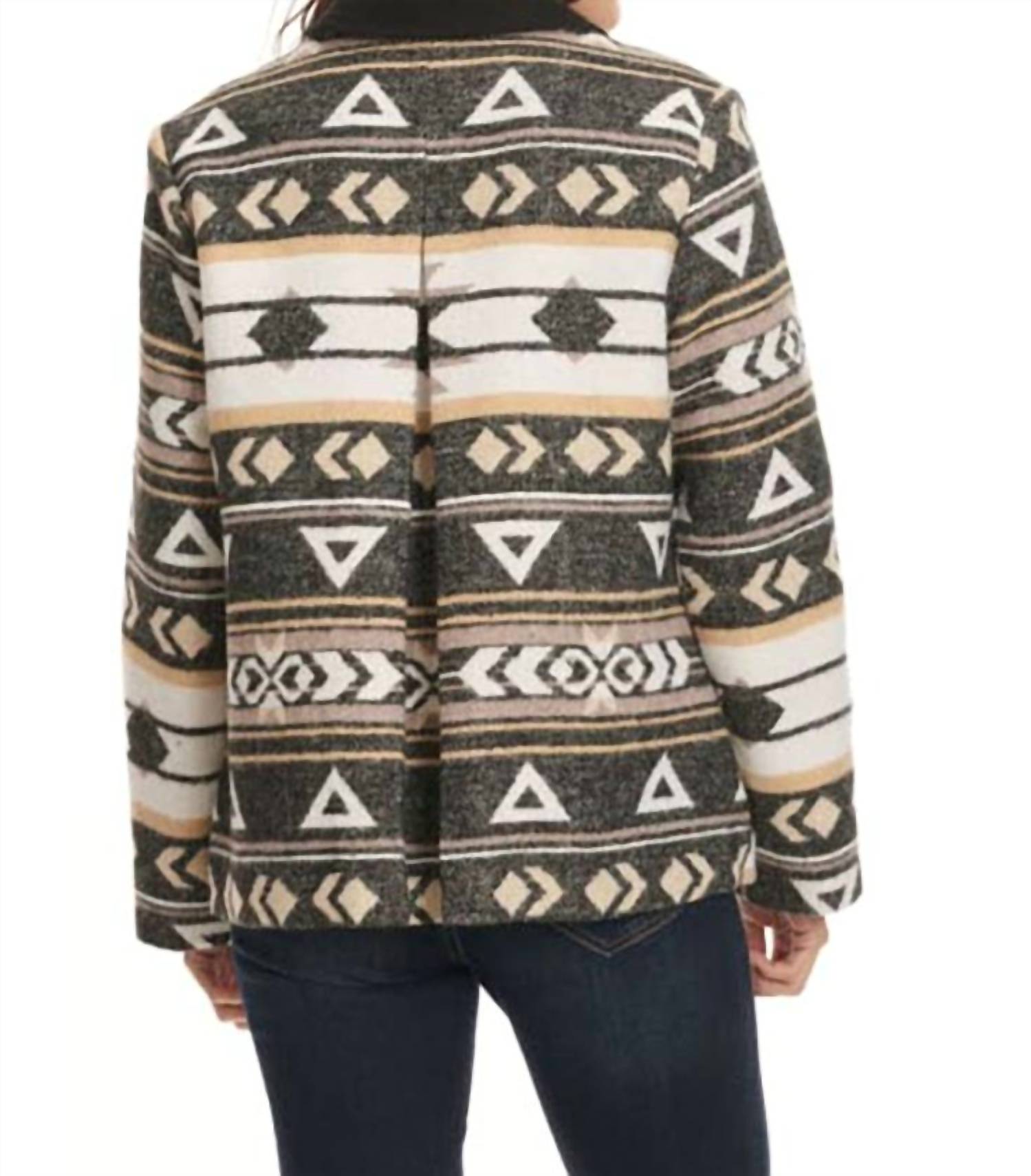 A jacket so versatile you can literally wear it with anything. Elevate your winter wardrobe with the Cripple Creek Winter White Women's Coat, featuring a striking Aztec print. Designed with long sleeves and a spread collar, this coat is crafted from high-quality polyester to ensure warmth and comfort. Closure is secure with a button-down front adorned with antiqued concho buttons. For added practicality, it includes two functional hand pockets and a back pleat, and it requires dry clean only for maintenance.
