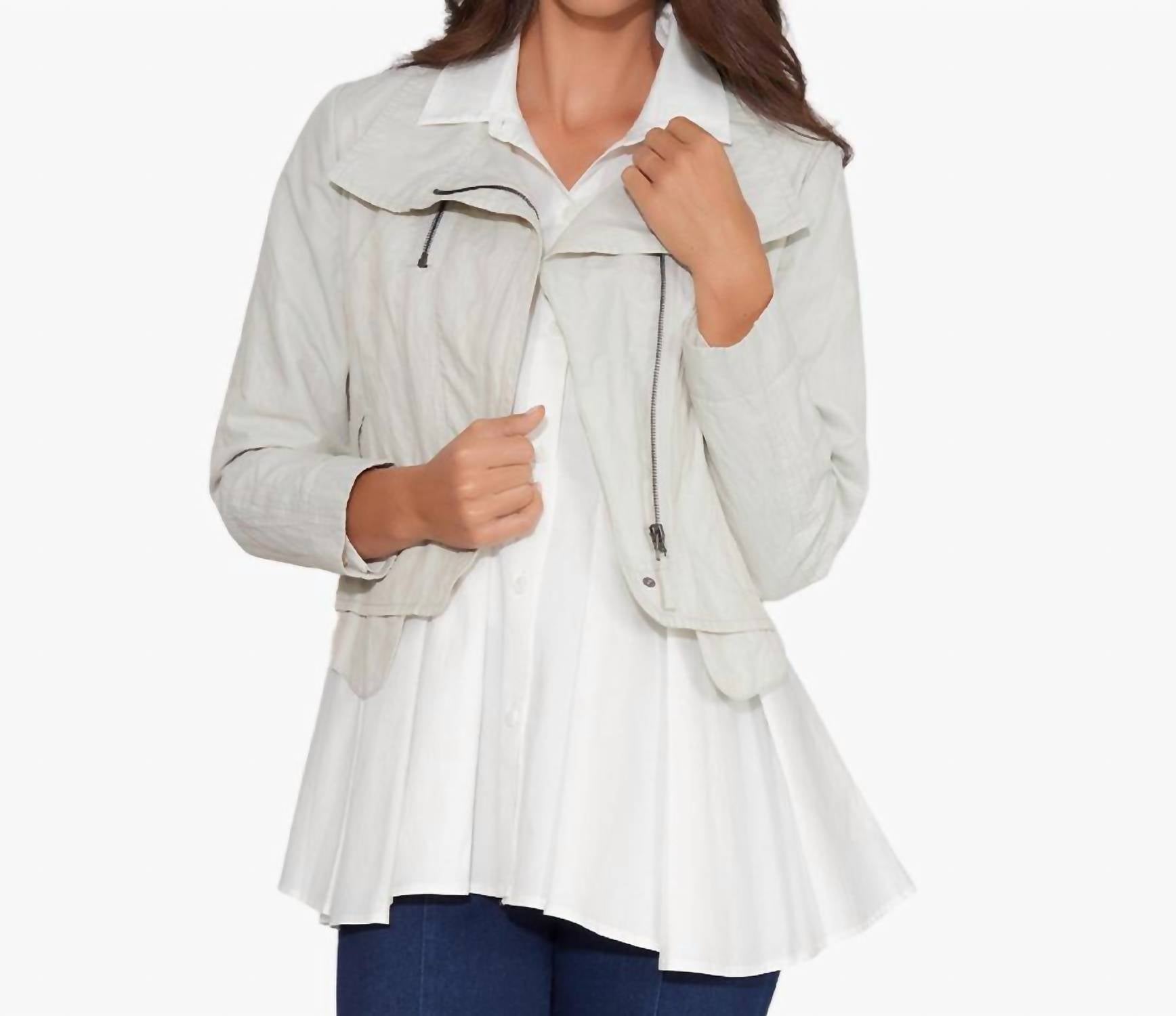 Detailed construction and unique design of our urban-inspired cropped jacket. Cut up panels in our proprietary cotton/metal fabric with lots of decorative top stitching, mixed with edgy moto inspired details. Back length is approximately 20" long on size S. Model is 5’11” wearing size S. 52% Cotton/ 43% Nylon/ 5% Metal. Imported. Machine Wash Or Dry Clean For Best Results.