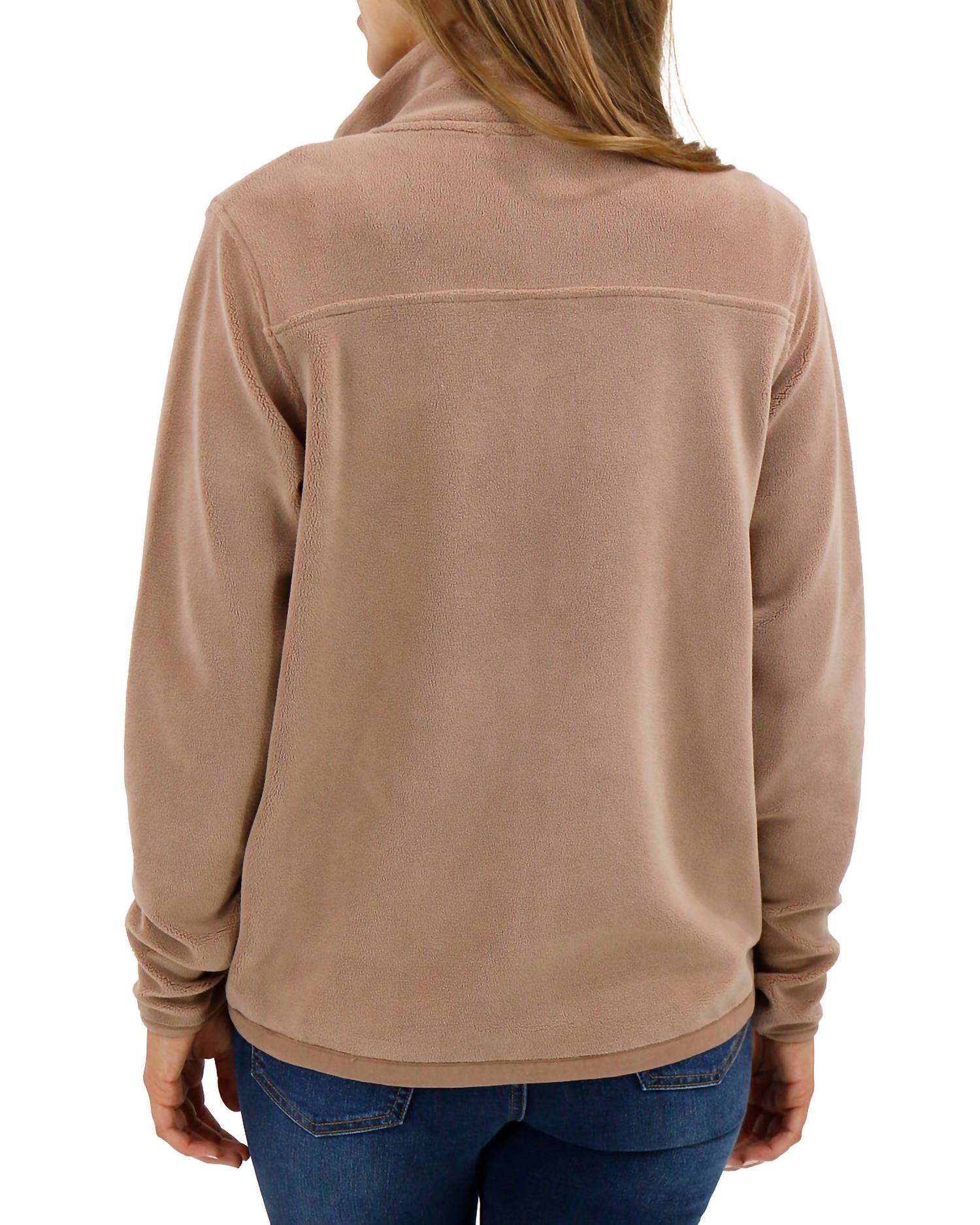 Cute, casual, and comfortable. This jacket is a must have. This jacket features long sleeves and a textured exterior in Cappuccino Tan with a 24.5-inch length. Composed of 95% polyester and 5% spandex microfleece, it offers softness and stretch with a dense knit feel. Snap closure. Care instructions include machine wash on a gentle cycle and line dry.