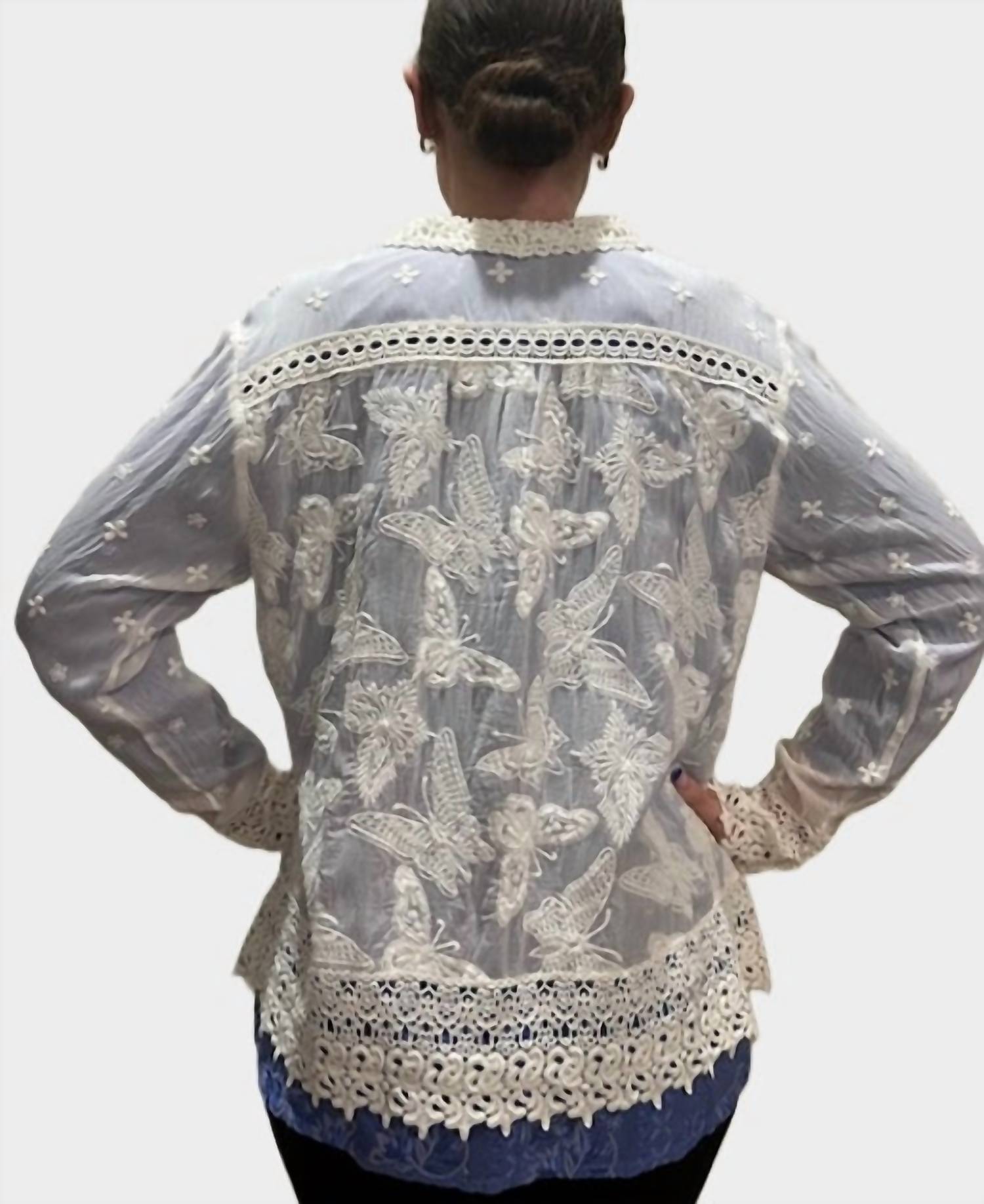 A casual yet cool jacket that every closset needs. The Yonah Butterfly Allover Jacket is beautifully feminine in its detailing and features a button-down front and a classic collared neckline. The sleeve cuffs, collar, and bottom seam are finished with a tone-on-tone design for a rich, polished look. The jacket is adorned with a delicate tone-on-tone butterfly motif and intricate embroidery detail on the front, adding a touch of elegance and charm. The model is wearing a size S. Machine Wash.