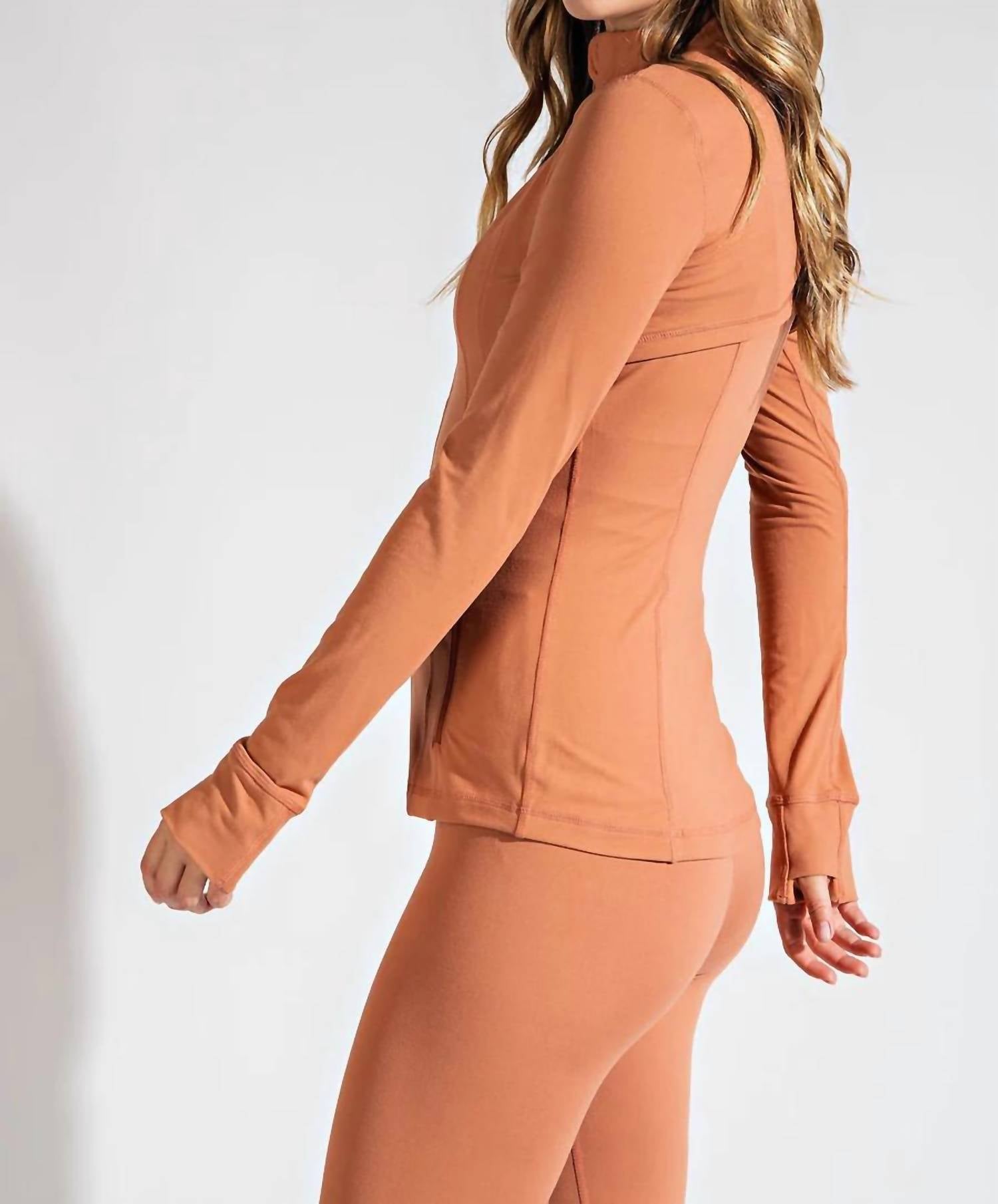 Athleisure jacket in rich burgundy. Butter-soft yoga fabric and open front zipper. Fitted yet stretchy jacket seamlessly blends comfort and style. Innovative mesh panel on the back provides ventilation. Ensuring you stay cool and composed. Crafted from a moisture-wicking blend of 84% Poly Microfabric and 16% Spandex. Offers a snug, supportive fit. True to size. Thumb holes. Complete with pockets. Functional and fashionable.