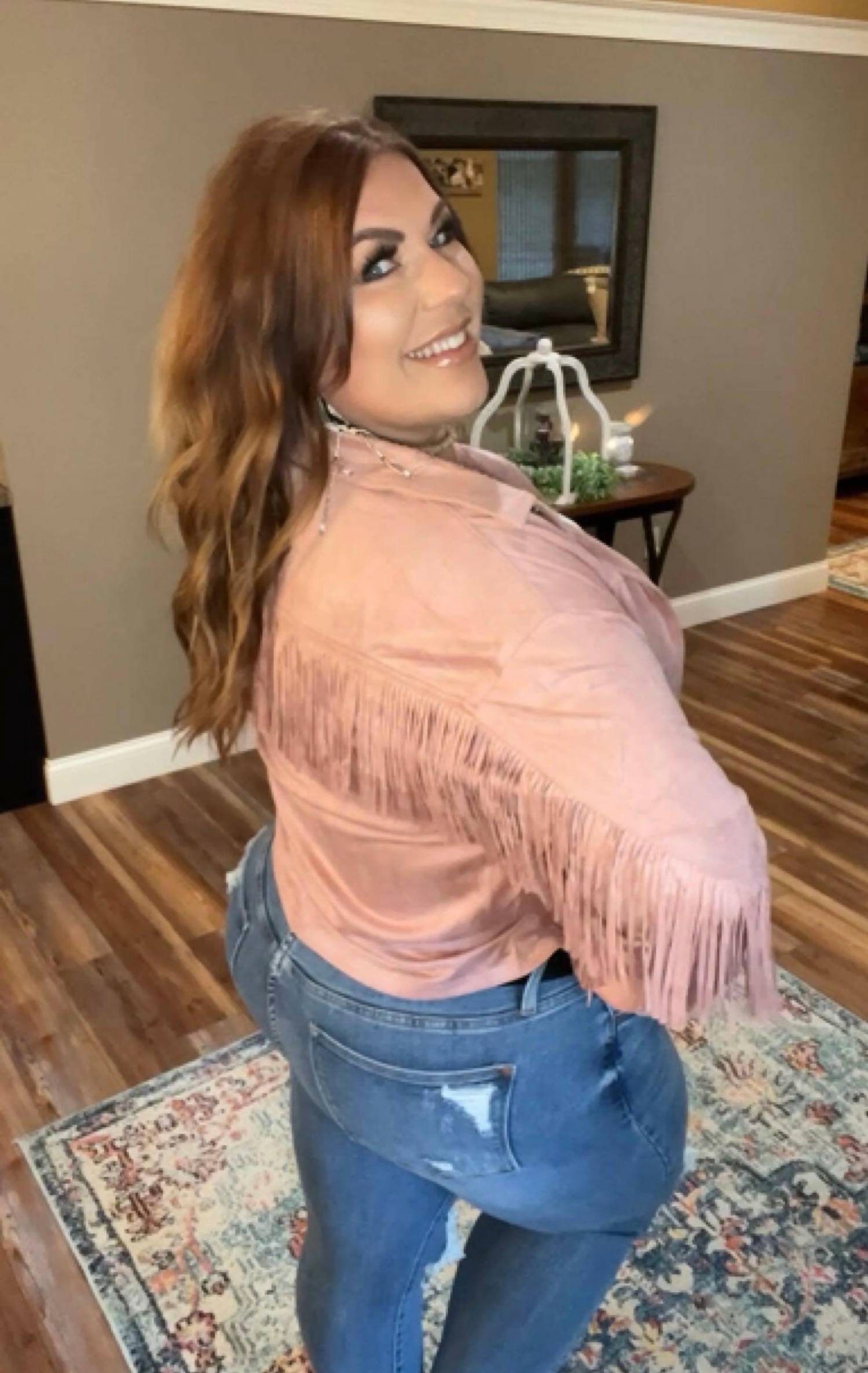 A casual yet cool jacket that every closset needs. Discover the Suede Tassel Fringe Detail Jacket by Mittoshop, a captivating addition to your collection in an elegant blush hue. With its long sleeves and crafted from luxurious suede, this cropped casual jacket offers timeless elegance and playful flair. Originating from a solid trend and featuring a classic collar, it includes practical pockets and a convenient snap closure for versatile styling. Care instructions: Machine wash and tumble dry, ensuring effortless maintenance for any occasion.