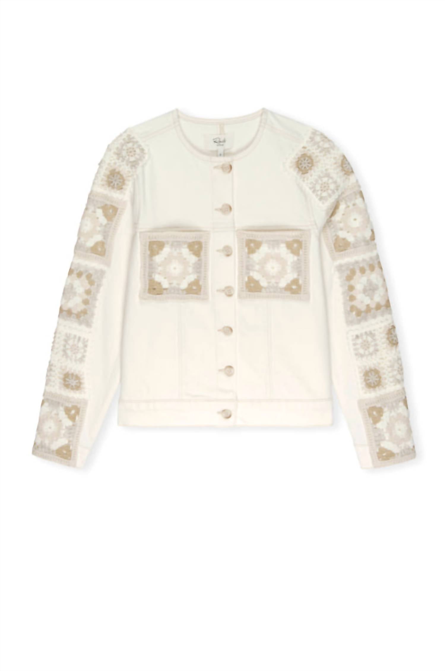 A casual yet cool jacket that every closset needs. Introducing the Lido Jacket by Rails, a statement piece in exquisite Vintage Ecru Crochet. This long-sleeve, collarless jacket features a cropped, boxy silhouette with contrast blanket stitching, redefining the classic denim look with a boho chic flair. Crafted from a textured cotton blend, it has a button closure and front body length of 21 3/4 inches (measured from size Small). Care for it effortlessly with machine wash cold inside out and tumble dry low for a breezy, ultra-feminine touch ideal for spring vacations.