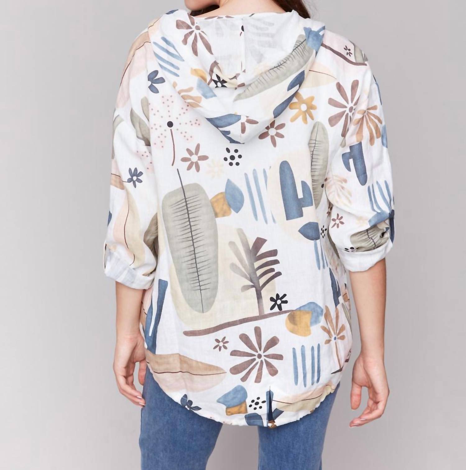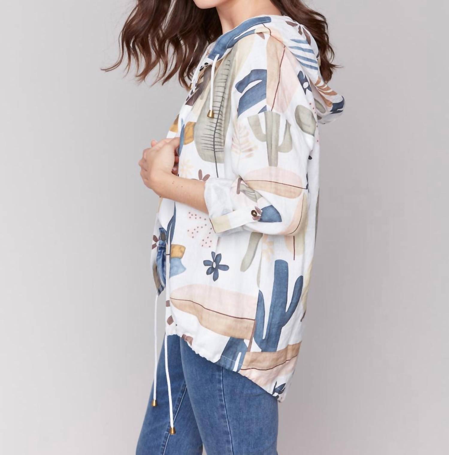 Cute, casual, and comfortable. This jacket is a must have. Embrace the cactus-inspired charm of the Hooded Roll-up Sleeve Duster Jacket by Charlie B, perfect for spring travel and Thanksgiving outings. Featuring long sleeves, this jacket is crafted from a light and airy linen blend composed of 55% linen and 45% rayon, adorned with an abstract cactus print in a vibrant color. With a convenient open front for easy wear and a cinch cord at the hem, it offers both style and practicality. Care instructions include machine washing on a delicate setting in cold water and line drying.