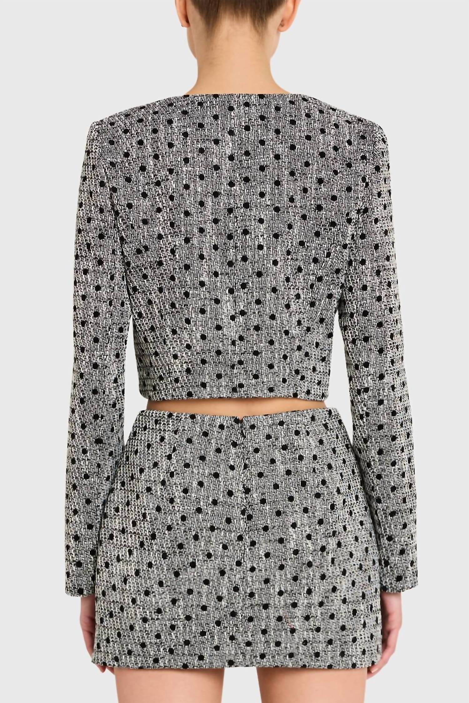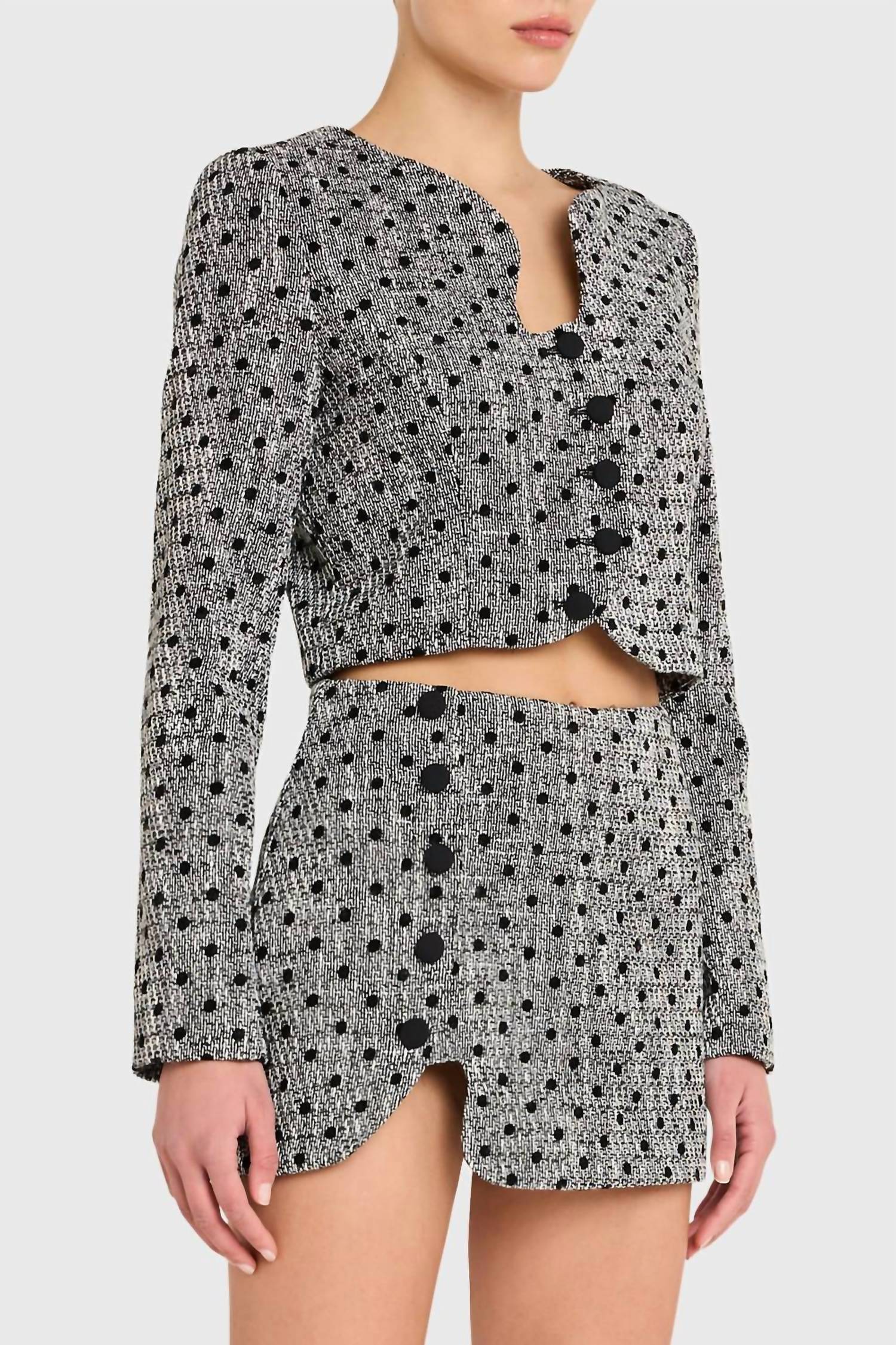A jacket so versatile you can literally wear it with anything. Introducing the Puzzle Jacket by Amanda Uprichard, a chic addition to your wardrobe with its distinct polka dot tweed fabric. This long sleeve jacket features a creative puzzle cutout at the V-neckline, complemented by a curved button closure. Its composition includes a self layer of 100% polyester with a lining of 95% polyester and 5% elastane, offering comfort and style for any summer event. This black and white jacket is tailored for evening occasions and requires dry cleaning for maintenance.