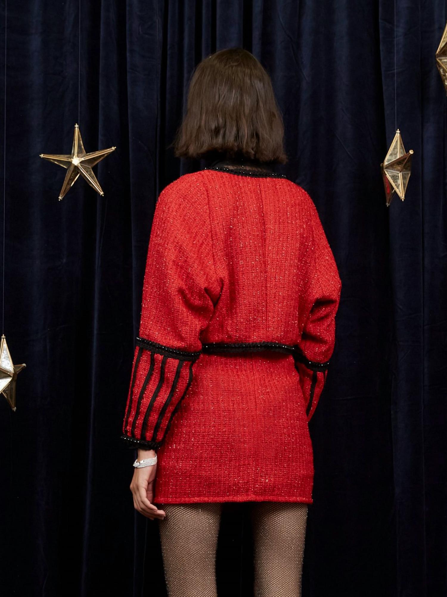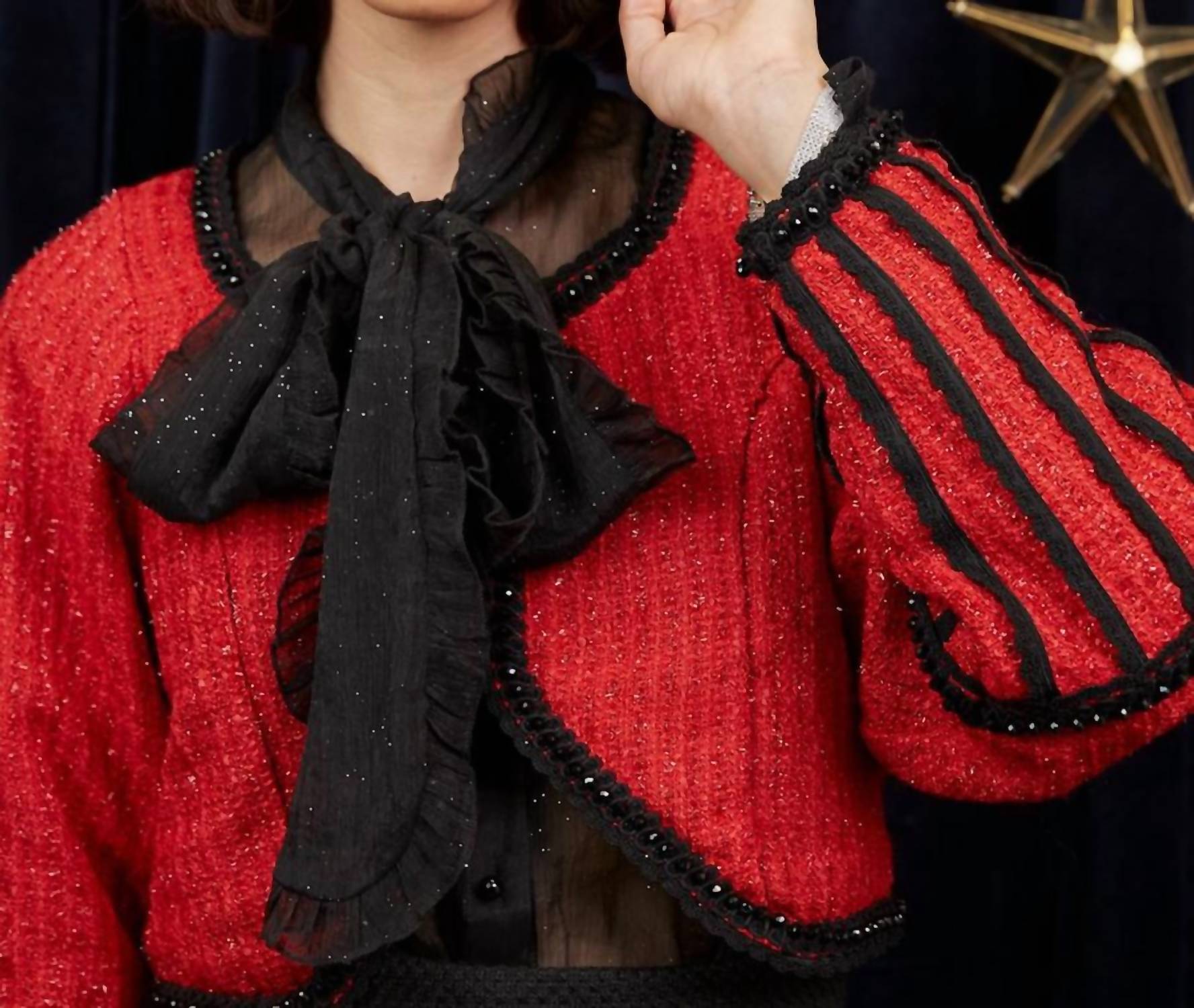 A jacket so versatile you can literally wear it with anything. Elevate your vacation wardrobe with the Carina Tweed Cropped Jacket by SISTER JANE, a minimalist piece in vibrant red. This jacket features a V-neck and long sleeves, embodying effortless style. Crafted from polyester with a textured pattern, it's designed for easy pull-on wear. Perfect for spring, this casual jacket does not include pockets.