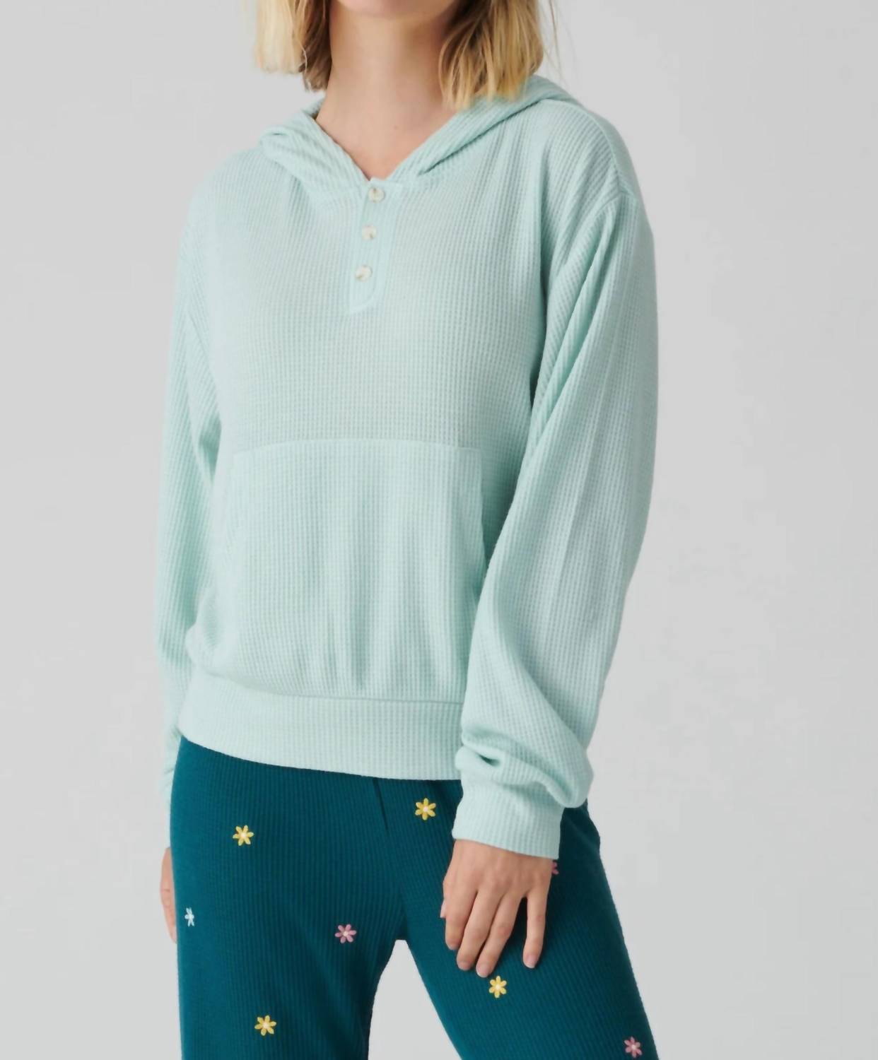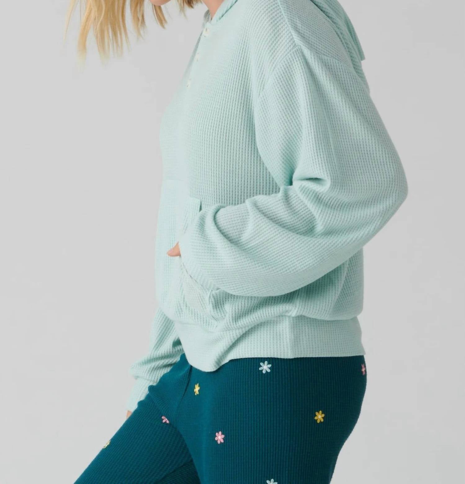 A casual yet cool jacket that every closset needs. Introducing the PJ Salvage Take It Easy Lounge Hoodie, a must-have for your casual wardrobe in a serene seafoam hue. This women's long sleeve hoodie features a lightweight brushed waffle thermal composition of 65% polyester and 35% rayon, making it ideal for streetwear or vacation lounging. With a relaxed hood, a three-button henley neck closure, and a cozy kangaroo pocket, it seamlessly blends style with comfort. Imported and designed for effortless care, simply machine wash and lay flat to dry.