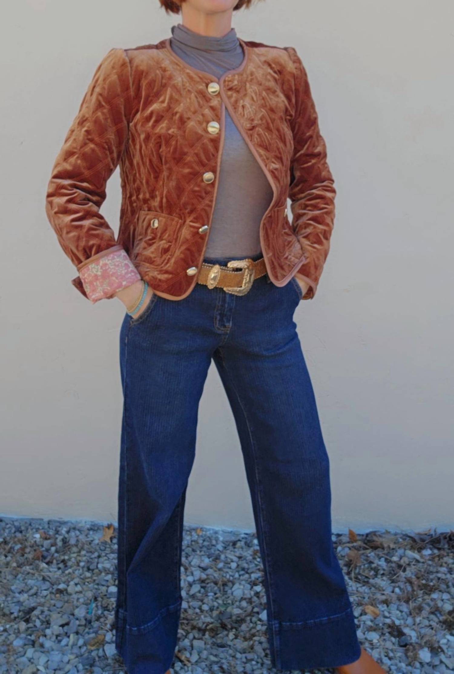 Cute, casual, and comfortable. This jacket is a must have. Introducing the Women's Velvet Jacket by Fate, a vintage-inspired piece in a warm rust tone. This casual jacket features long sleeves and is crafted from a luxurious quilted velvet with a slightly cropped length, enhancing its flattering silhouette. It includes gold button detailing for a polished look and a contrast floral lining for added charm. Ideal for fall layering, its soft structure makes it perfect for vacations.
