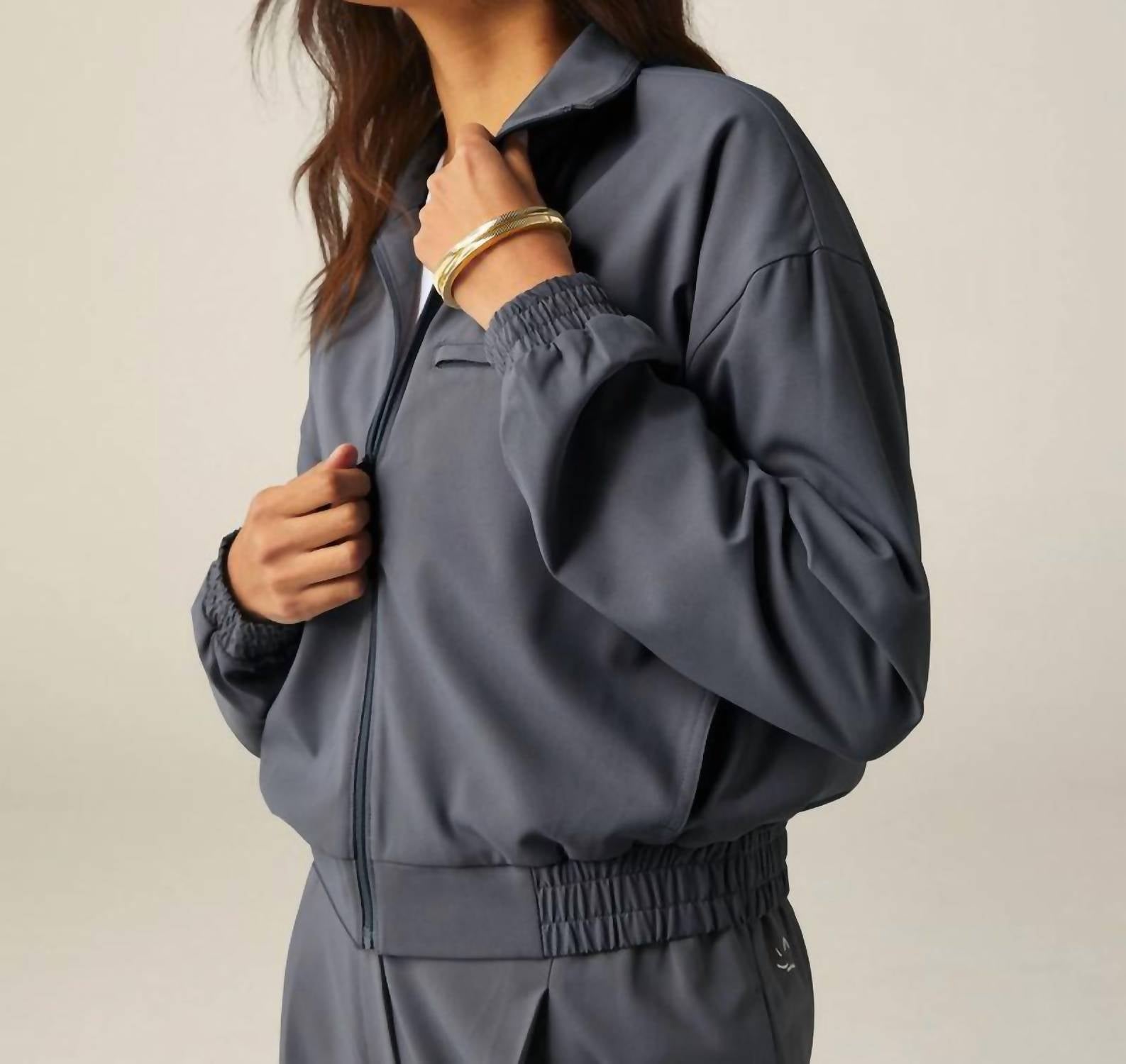 Step up your travel style with the Status Pocket Sleeve Cropped Jacket by Beyond Yoga, designed for the modern woman in Night Shadow. This minimalist, solid-colored jacket features long sleeves and a chic, cropped length perfect for fall adventures. Crafted from 100% JetStretch Polyester, it boasts a relaxed fit with numerous pockets, including a patch pocket on the right sleeve, a drop-in zip welt pocket at the chest, and convenient side seam pockets. Fully lined with mesh and secured with a zip closure, this versatile piece offers a polished drape, easily maintained with hand wash care.