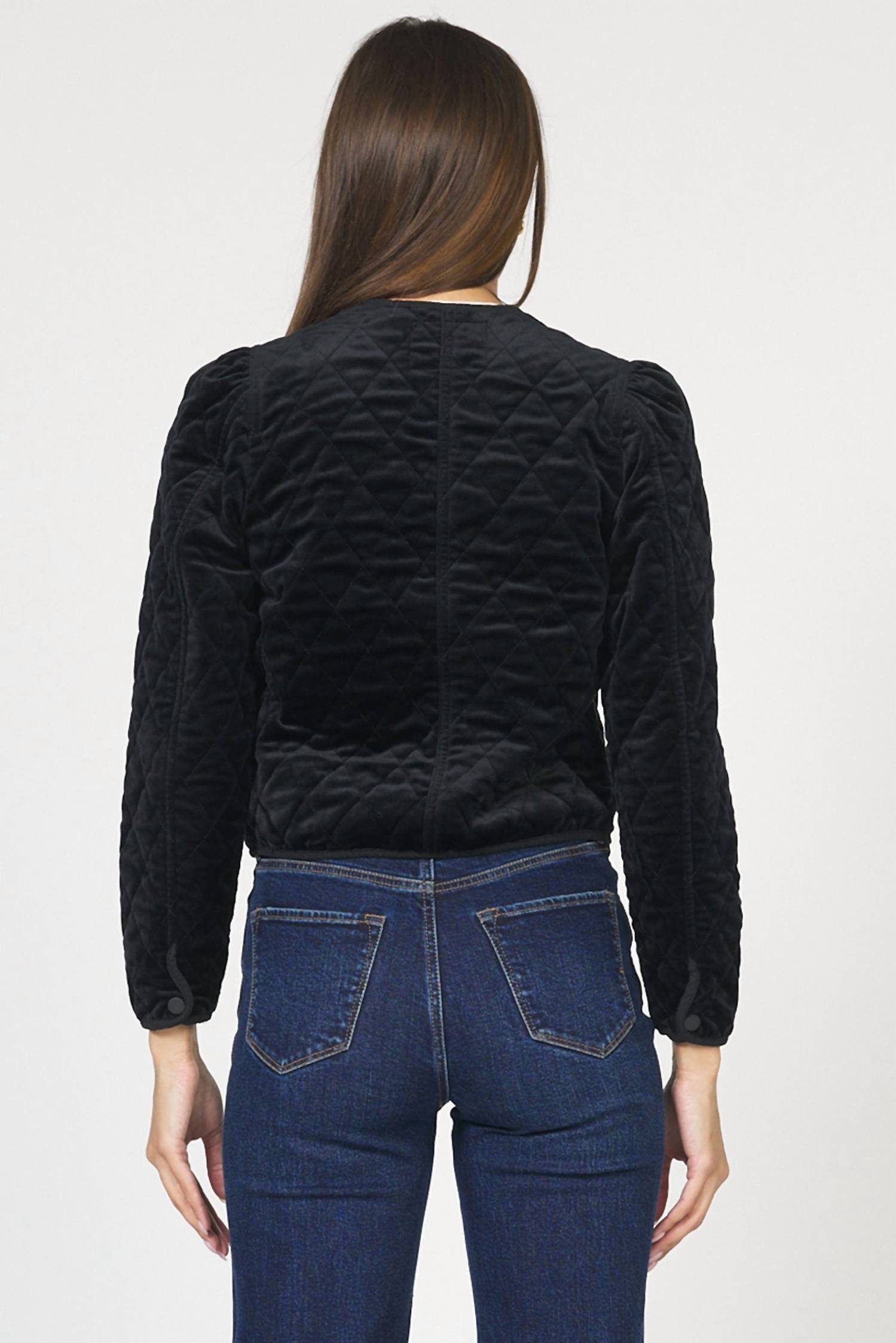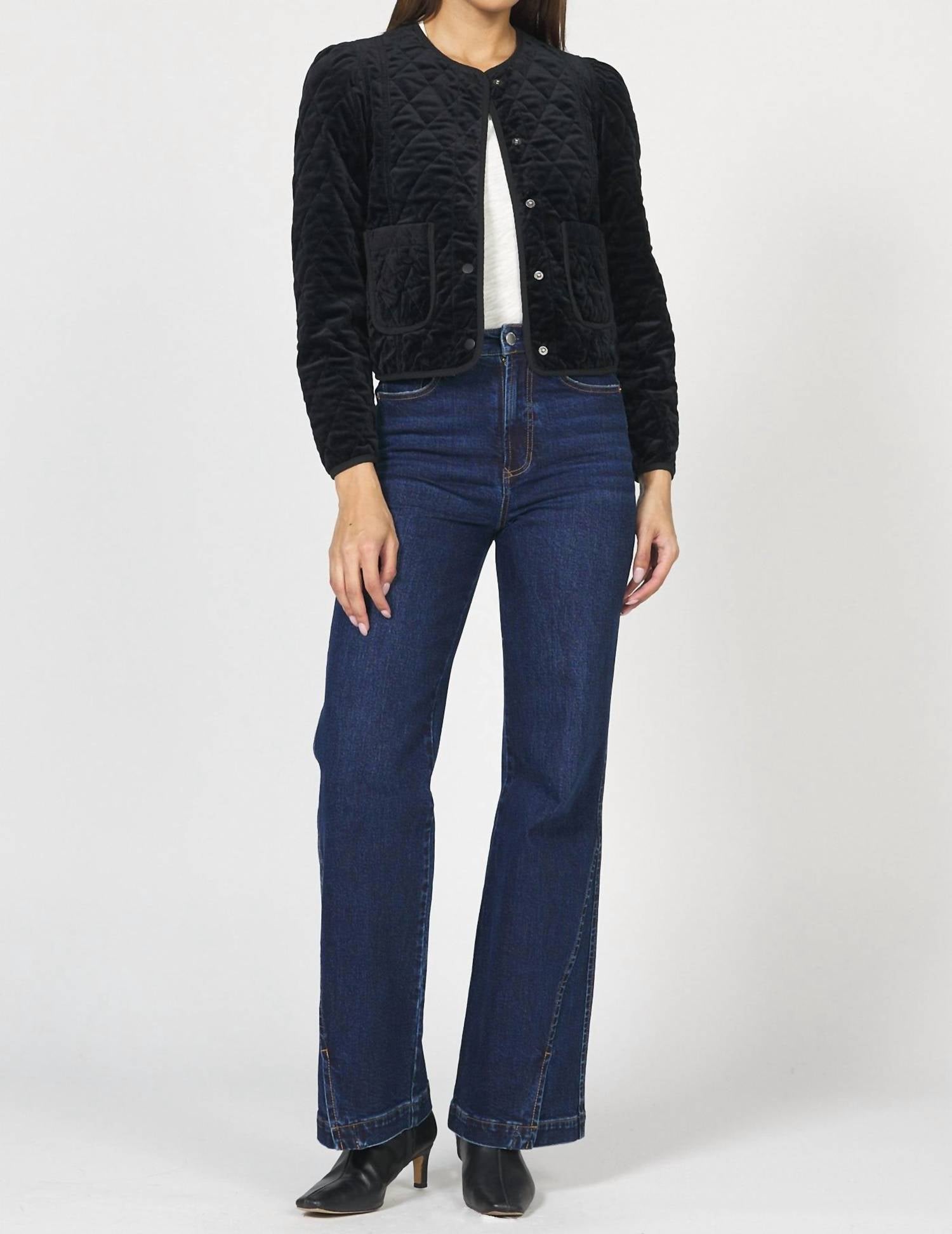 A casual yet cool jacket that every closset needs. Introducing the Kit Quilted Jacket by DEAR JOHN DENIM, crafted in luxurious black velvet. This long sleeve jacket features a crewneck and a chic cropped design that complements high-waisted styles seamlessly. It's made in a solid pattern with a convenient snap closure, while functional pockets add practicality to its sophisticated look. Hand wash and line dry for maintaining its plush feel and lasting finish.