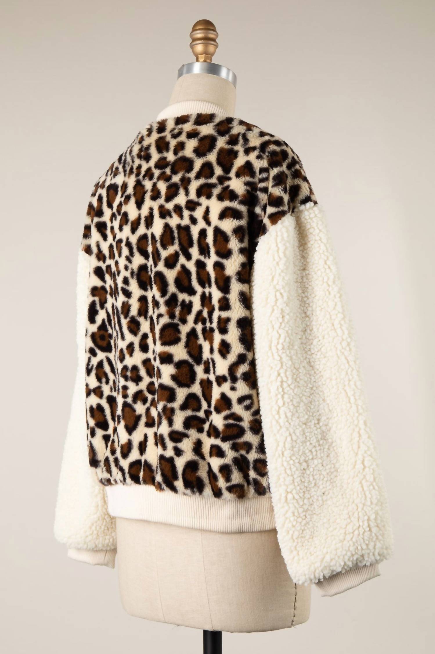 A casual yet cool jacket that every closset needs. Introducing the Women's Leopard Sherpa Jacket by Easel, a cozy must-have for stylish winter travels. This casual jacket features a striking animal pattern in brown, black, and white hues, complete with a crewneck and long sleeves for added warmth. The jacket secures with a convenient zip closure, making it an effortless addition to your everyday wardrobe. Perfect for layering over a t-shirt and jeans, this trendy Y2K-inspired piece offers travel-ready style with comfort at its core.