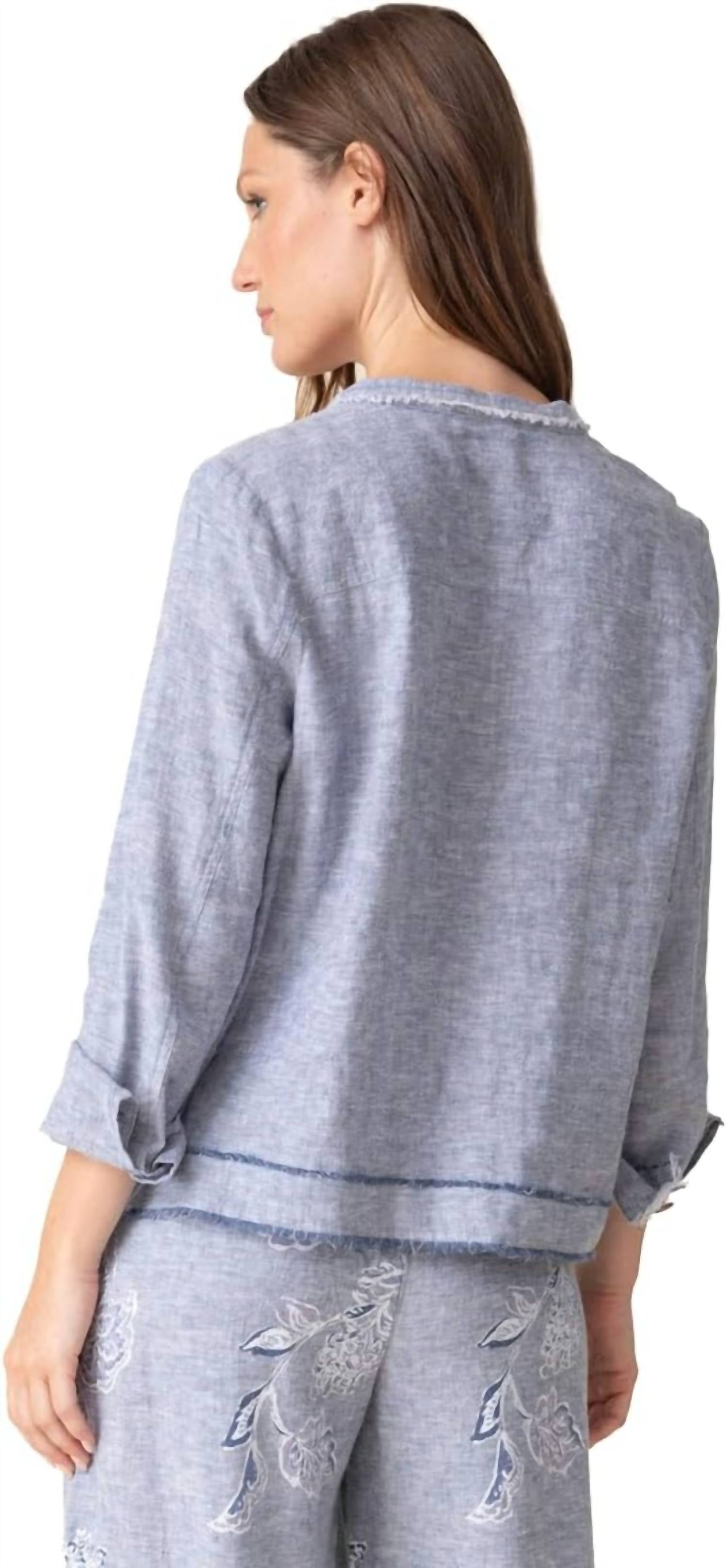 A casual yet cool jacket that every closset needs. Crafted from a blend of 80% linen and 20% cotton, this button-down jacket features cross-dyed yarns that create a subtle two-tone effect enhanced by fringe accents throughout. Fringe trims the patch pockets, sleeve cuffs, center front, and collar, giving this versatile layer a fresh, elevated twist. Finished with Agoya shell buttons and practical front pockets, it’s a refined yet relaxed piece that adds texture and personality to any wardrobe.
