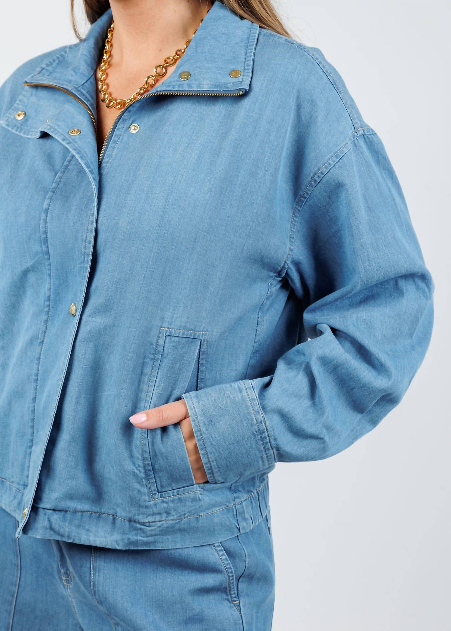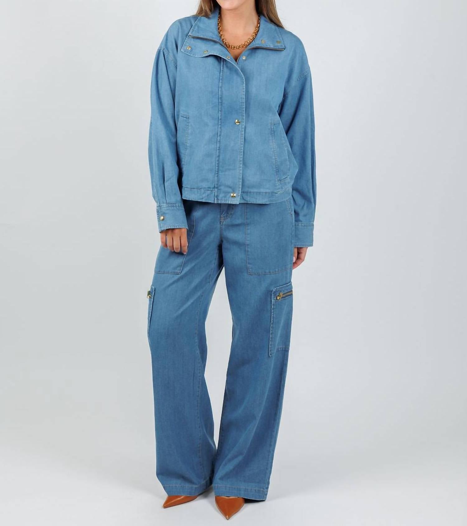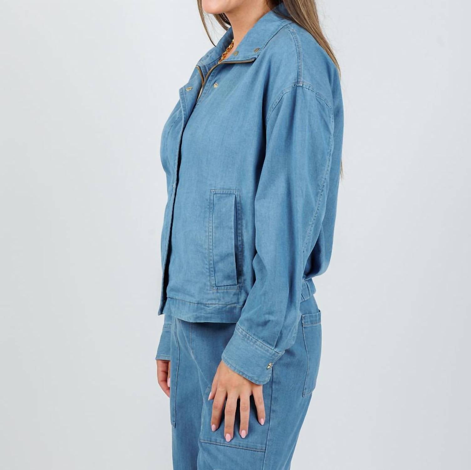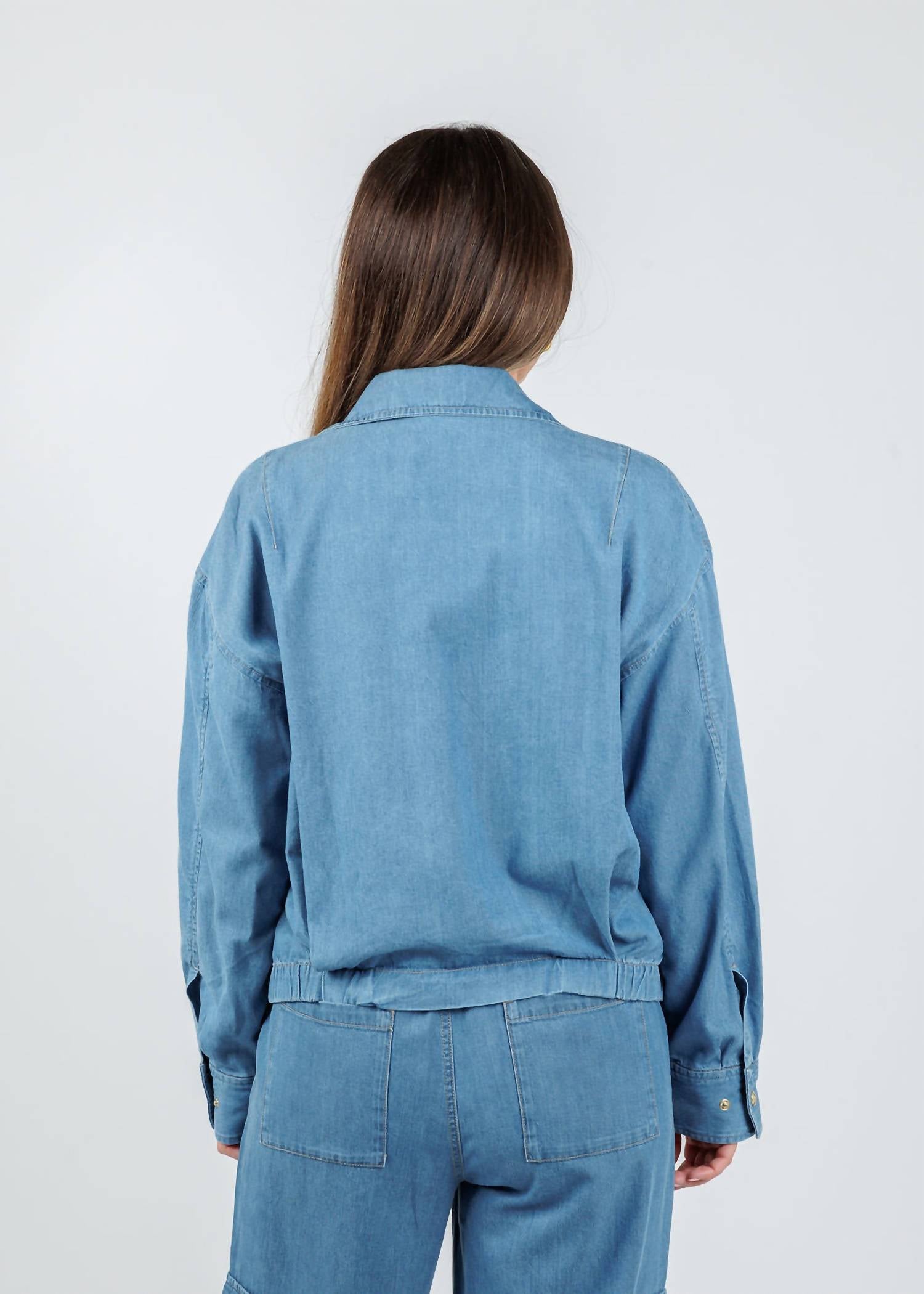 A casual yet cool jacket that every closset needs. Discover the Hinson Wu Louise Long Sleeve Denim Jacket, a medium-wash gem that merges timeless style with a modern twist ideal for the fall season. Crafted from a blend of 60% Tencel and 40% Cotton, this jacket offers a relaxed fit for effortless layering. A zip-front and snap button placket pair with chic gold hardware, while its functional flap-stitched pockets lend utility-inspired charm. Model is wearing a size XS (Faryn is 5'6" with a 34" bust, 28.5" waist, 31" hip, and 29" inseam).