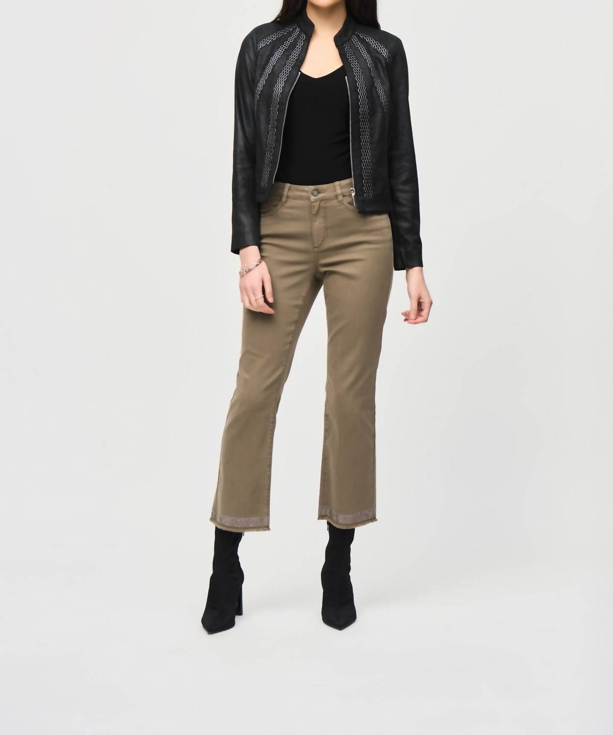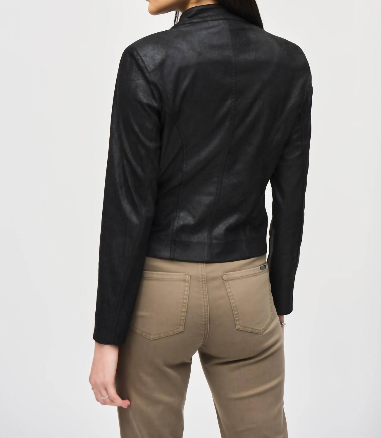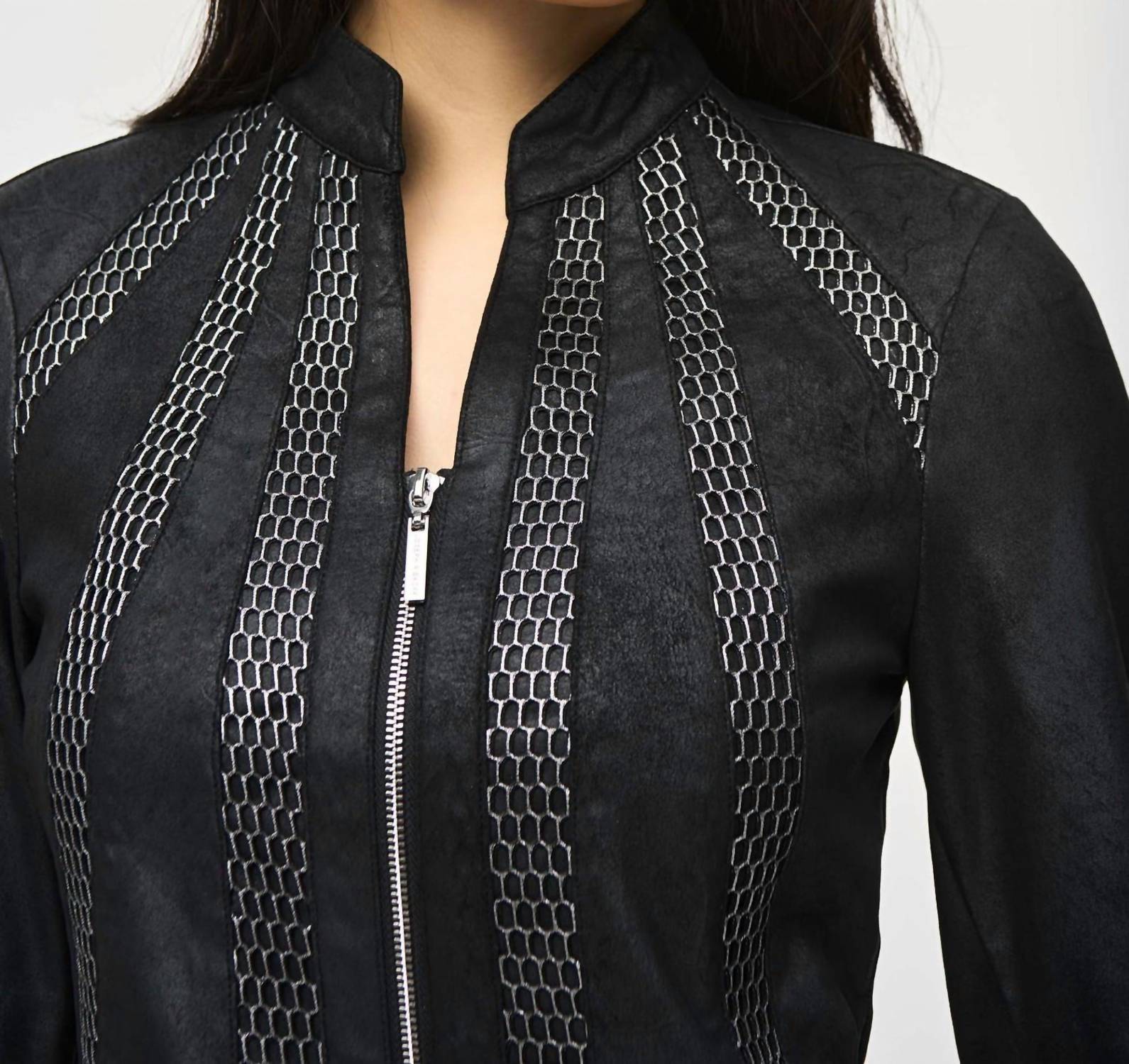 A jacket so versatile you can literally wear it with anything. This straight-silhouette, crew-neck jacket is made from a blend of 90% polyester and 10% spandex, featuring a faux suede front, metallic mesh inserts, and an exposed front zipper closure. It has long, straight sleeves and is lined. Care instructions require hand washing cold with like colors, hanging to dry in shade, and low ironing on the reverse side only if needed. It must not be bleached, tumble dried, or dry cleaned.