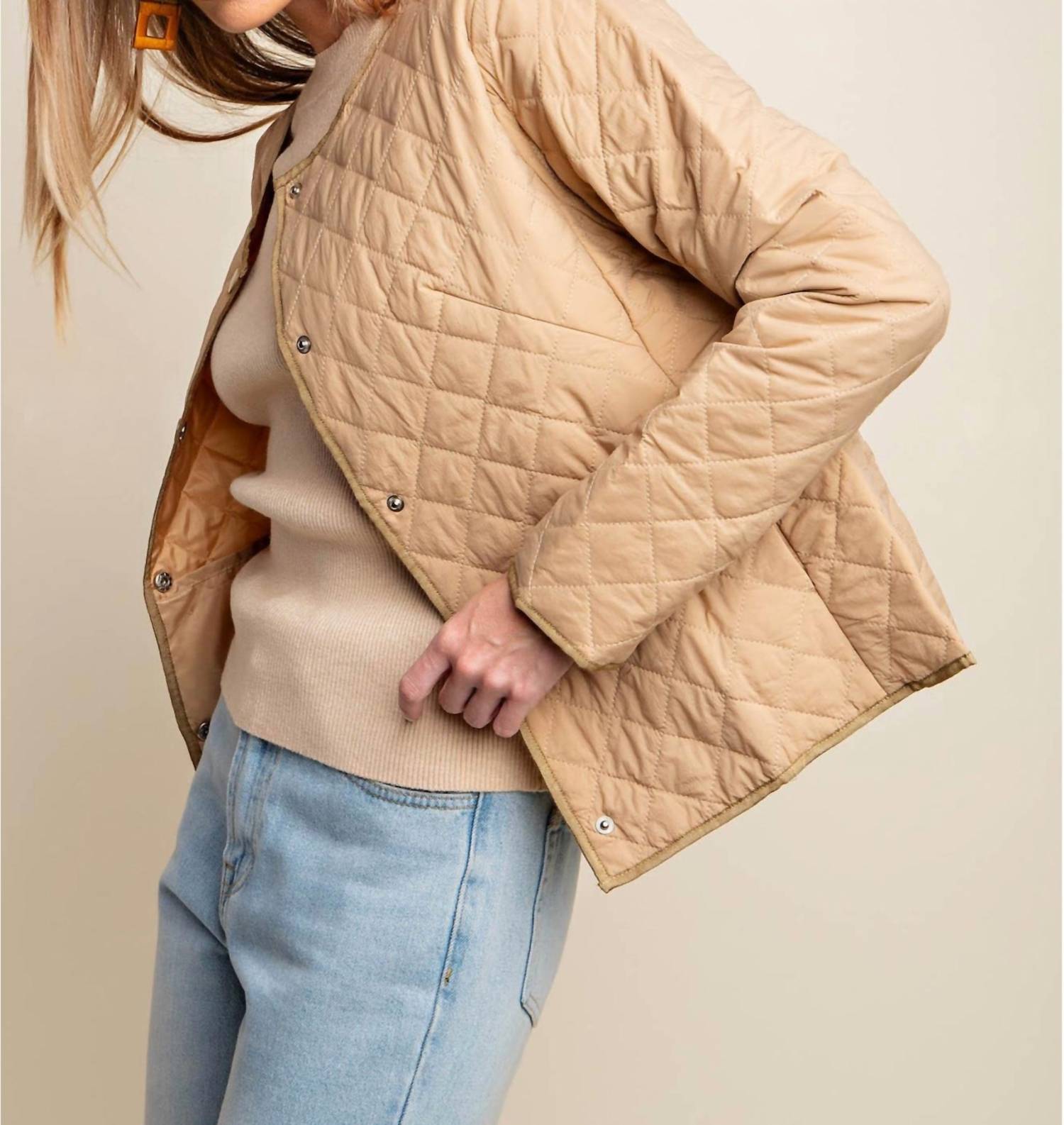 A jacket so versatile you can literally wear it with anything. Introducing the Gia Quilted Liner Style Jacket by KORI, an essential piece for your spring wardrobe in a chic brick hue. Designed with long sleeves and a textured finish, it offers a stylish and sleek look. This women's jacket features a crewneck and a convenient snap front closure, making it both practical and fashionable. Perfect for a holiday party or casual outing, it ensures you'll stay warm and water-resistant in any weather.