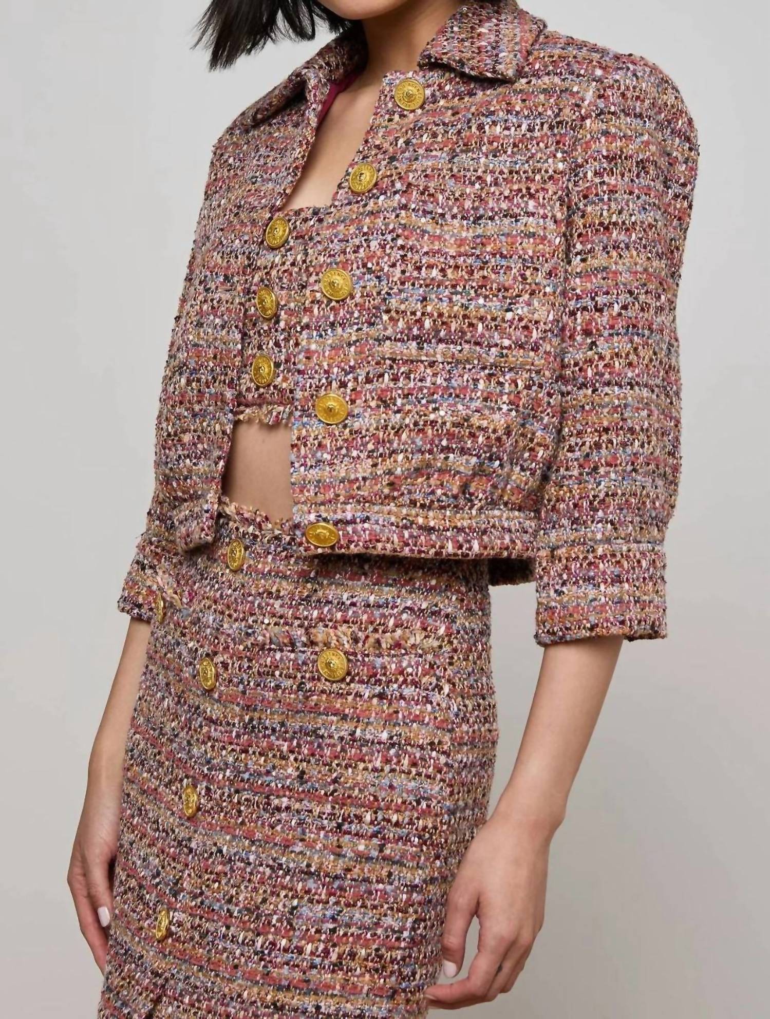 A casual yet cool jacket that every closset needs. Elevate your ensemble with the Jia Tweed Jacket by L'Agence, a preppy addition in a charming mauve hue. Designed with three-quarter sleeves, this jacket boasts a colorful textured tweed finish with lion head button closures for added flair. Crafted from polyester, it features shoulder pads and is fully lined, delivering both structure and comfort. Perfect for engagement occasions and made for the fall season, this piece should be dry cleaned to maintain its pristine condition.