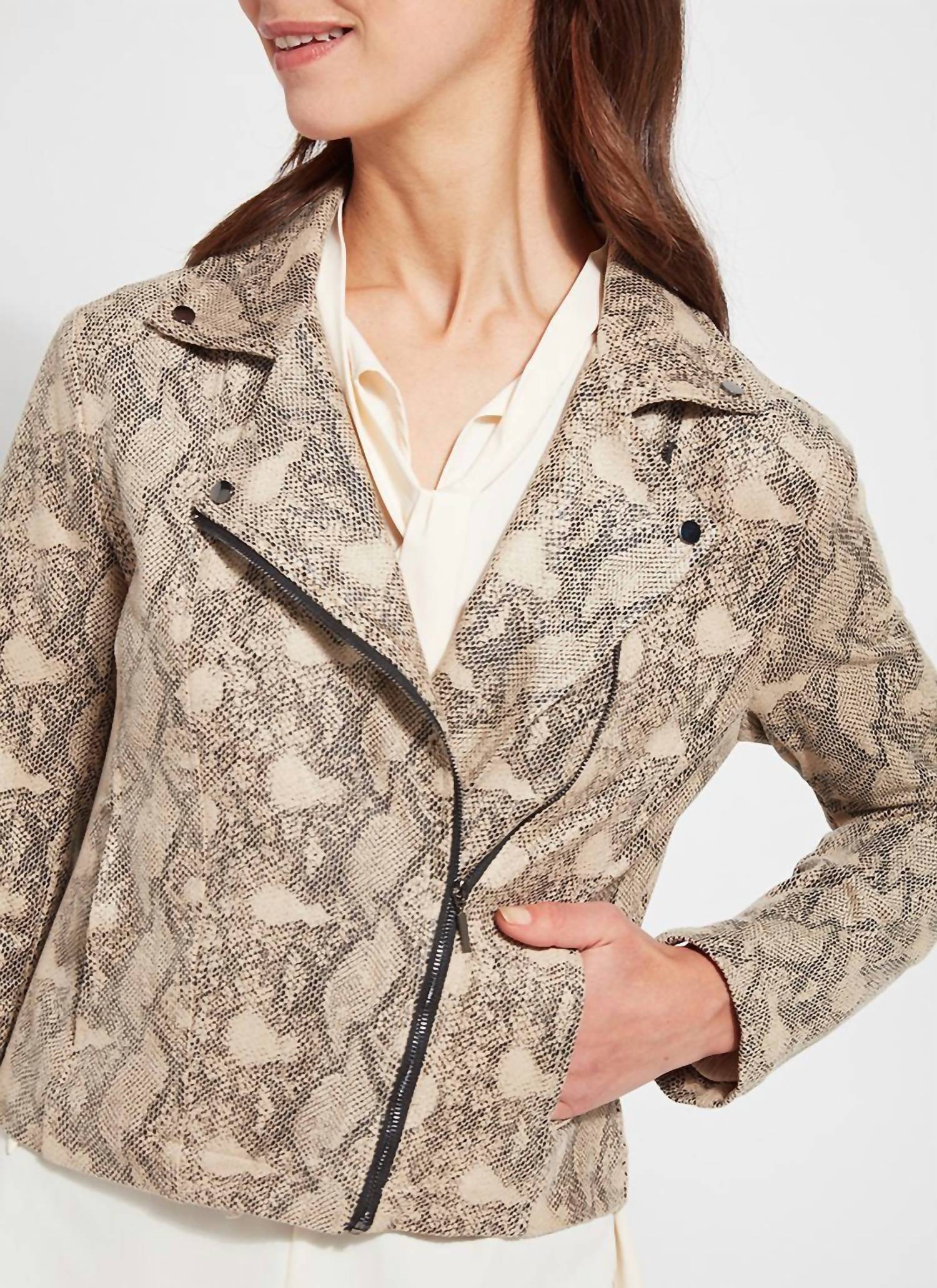 A casual yet cool jacket that every closset needs. Introducing the Foil Moto Jacket by Lysse, a standout piece in chic beige perfect for streetwear style. Designed with long sleeves and crafted from 92% Polyester and 8% Spandex, this jacket showcases a dynamic 4x-stretch for all-day comfort. It features a practical zip closure, collar neckline, and stylish animal pattern accents. Pockets included for convenience; ideal for elevating your vacation wardrobe this spring.