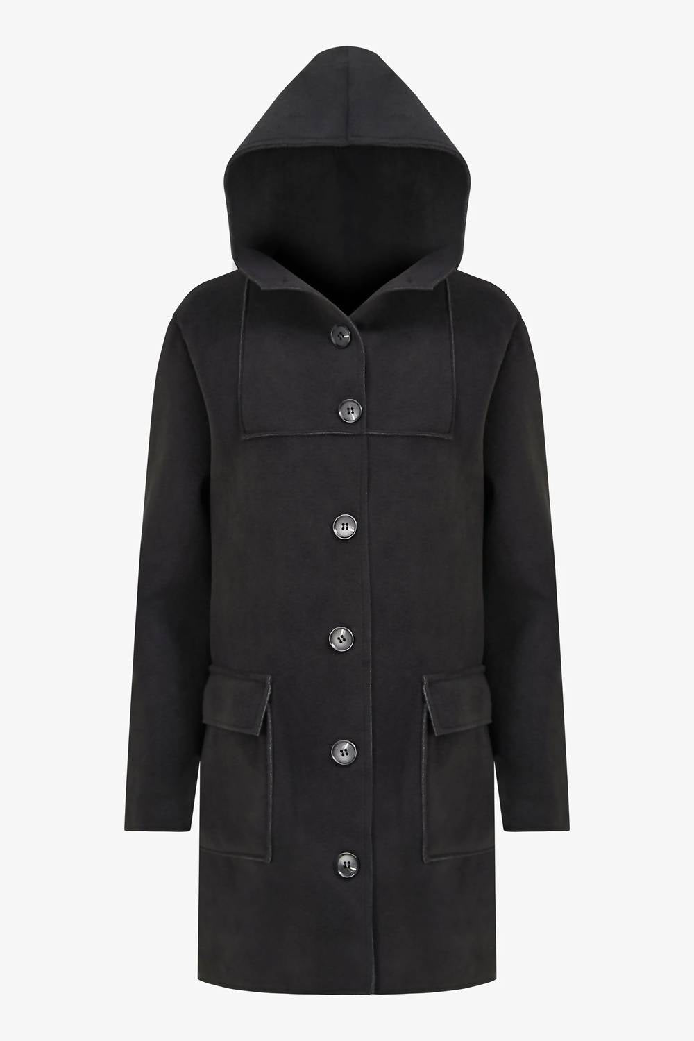 A jacket so versatile you can literally wear it with anything. Introducing the Women's Woven Hooded Button Long Coat by M made in Italy, a sophisticated and versatile wardrobe essential in classic black. This stylish mid-length coat features long sleeves and a practical hood, complete with convenient patch pockets. Expertly crafted in a blend of 60% Viscose, 35% Polyester, and 5% Elastane, it offers both comfort and durability. Produced in Italy, this coat ensures a refined fit and can be machine or hand washed in cold water and line dried for easy care.
