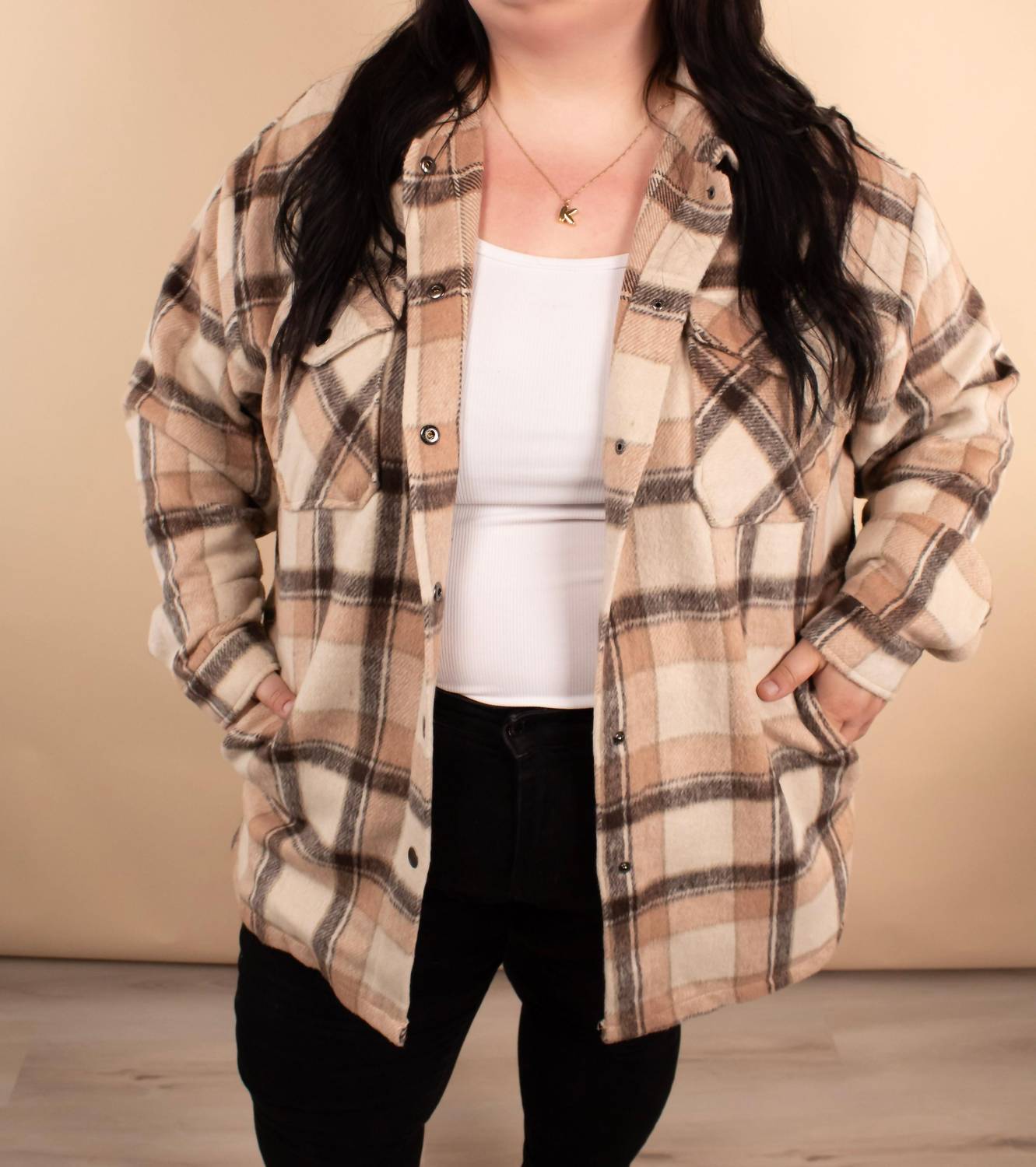 Cute, casual, and comfortable. This jacket is a must have. Meet your new favorite fall layer, the Element Plaid Shacket by Michelle Mae in a stunning Sunset hue. This long sleeve casual jacket is made from 100% polyester, providing a relaxed fit that's perfect for layering over tees or sweaters. With a functional button closure and full torso and hip coverage, it offers a polished look accented with classic plaid. Care: Hand wash and line dry for best results. Model wears size 1XL (Kaitlin) and 3XL (Kenzie).