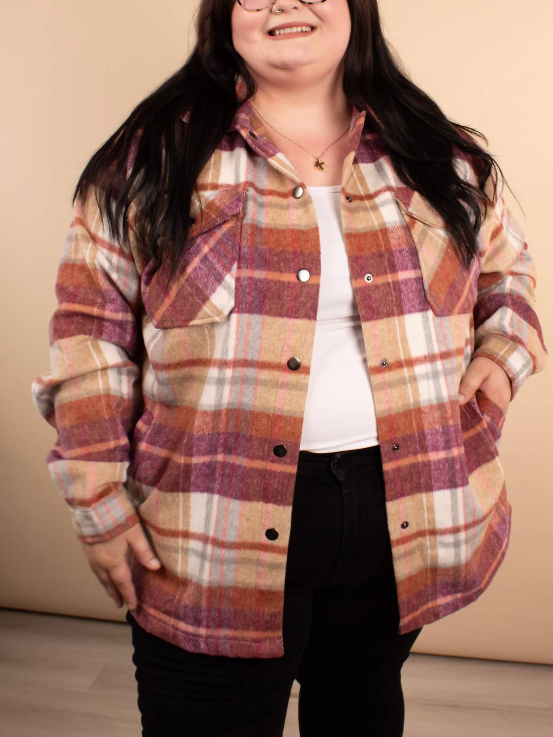 Cute, casual, and comfortable. This jacket is a must have. Meet your new favorite fall layer, the Element Plaid Shacket by Michelle Mae in a stunning Sunset hue. This long sleeve casual jacket is made from 100% polyester, providing a relaxed fit that's perfect for layering over tees or sweaters. With a functional button closure and full torso and hip coverage, it offers a polished look accented with classic plaid. Care: Hand wash and line dry for best results. Model wears size 1XL (Kaitlin) and 3XL (Kenzie).