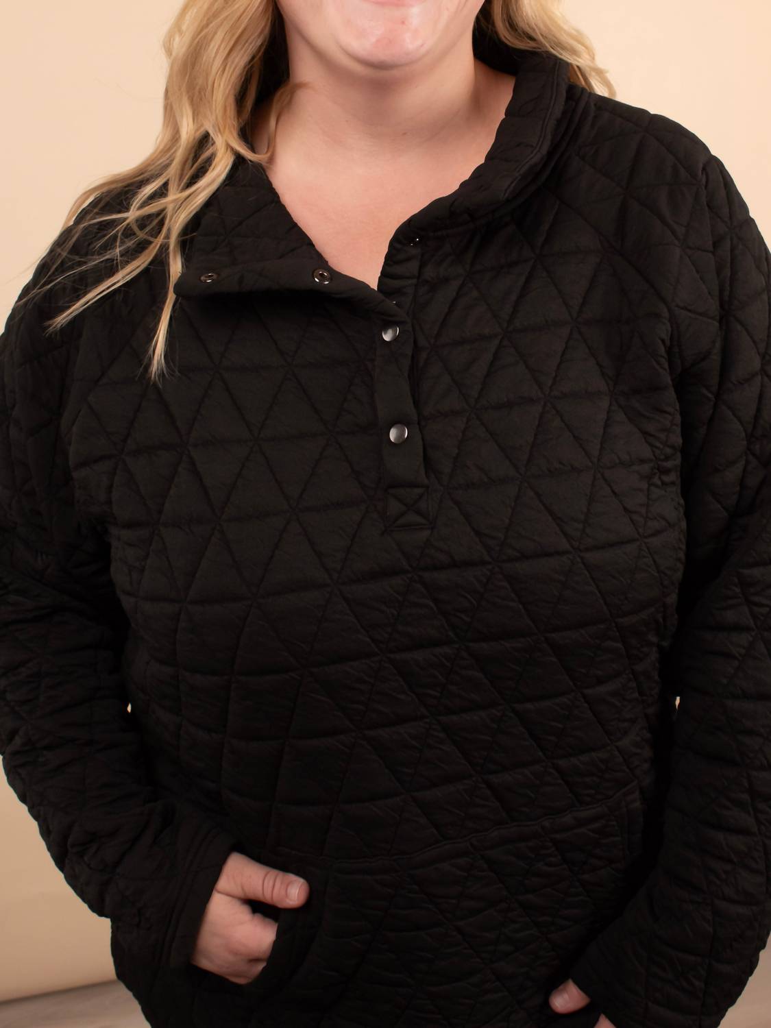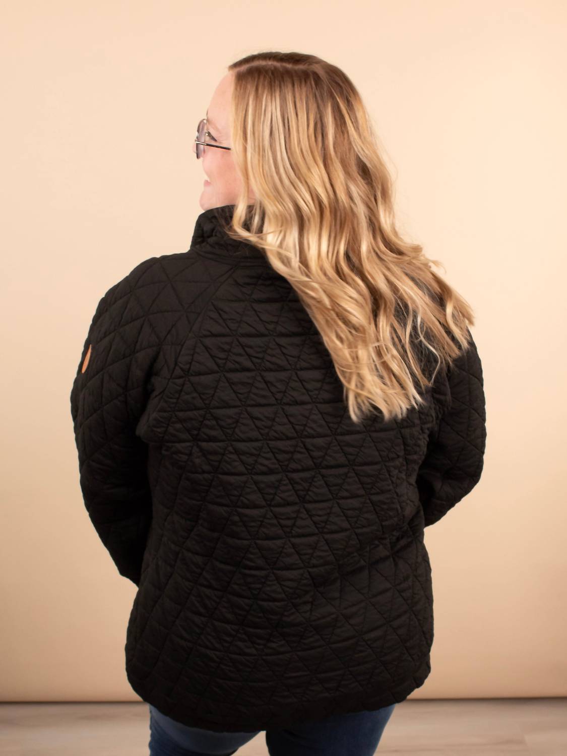 A casual yet cool jacket that every closset needs. Elevate your wardrobe with the Michelle Mae Structured Snap Button Pullover Jacket, a stylish option in classic black. This long-sleeve jacket features geometric quilting for added texture and a snap-button neckline that ensures a polished appearance. Crafted from a comfortable blend of 95% Polyester and 5% Spandex, it offers a structured feel perfect for travel or casual outings. Care instructions include hand washing and laying flat to dry, ensuring lasting quality and style. Kaitlin is seen wearing a size 1XL.