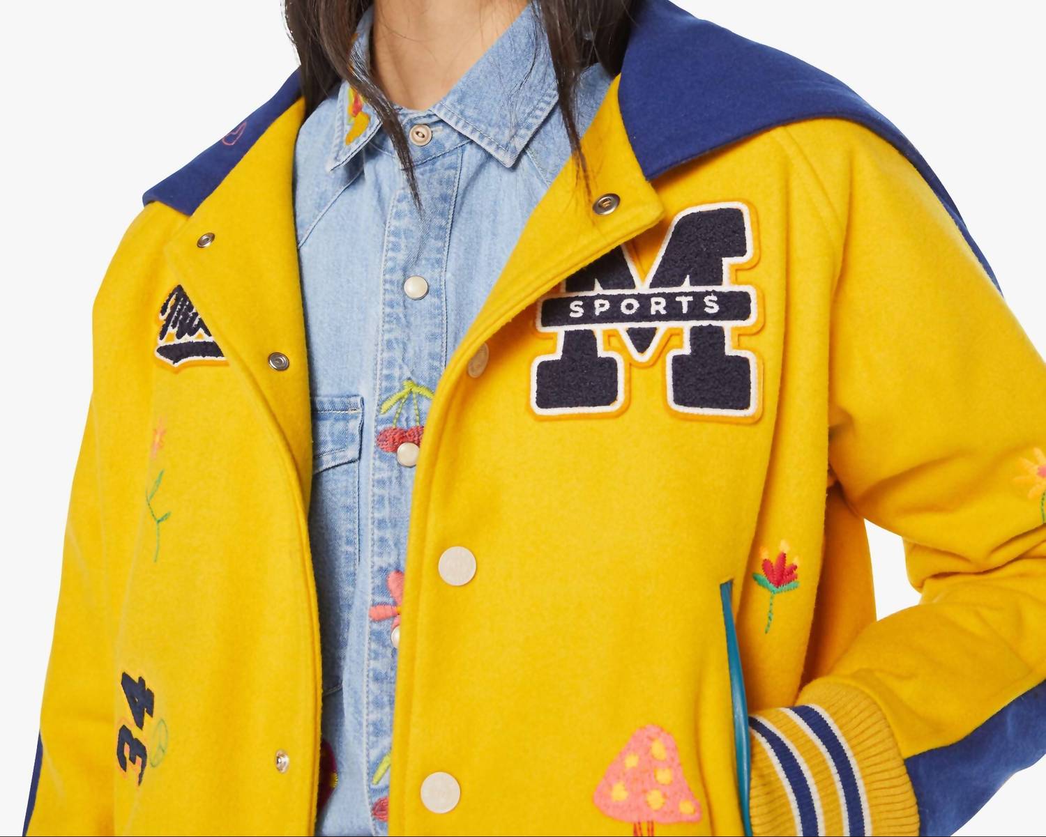 A casual yet cool jacket that every closset needs. Elevate your streetwear wardrobe with the Split Hood Team Spirit Jacket by Mother, an eye-catching piece crafted in a cozy 50% wool, 50% polyester. This long-sleeve jacket features a unique split zip-up hood, accented with side slit pockets and a snap closure for easy wear. Adorned in a vibrant yellow with navy contrast, it's detailed with vintage-style patches and ribbed trim. Care instructions recommend dry cleaning to maintain its bold look.