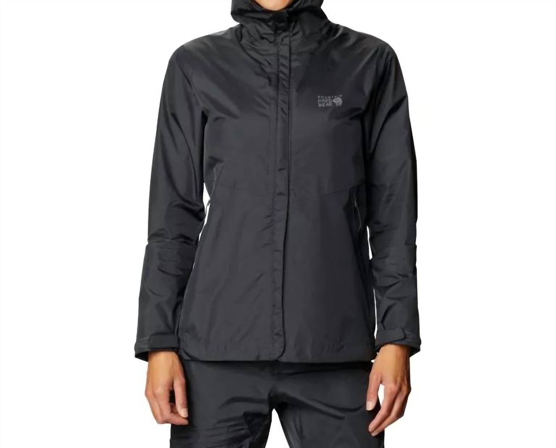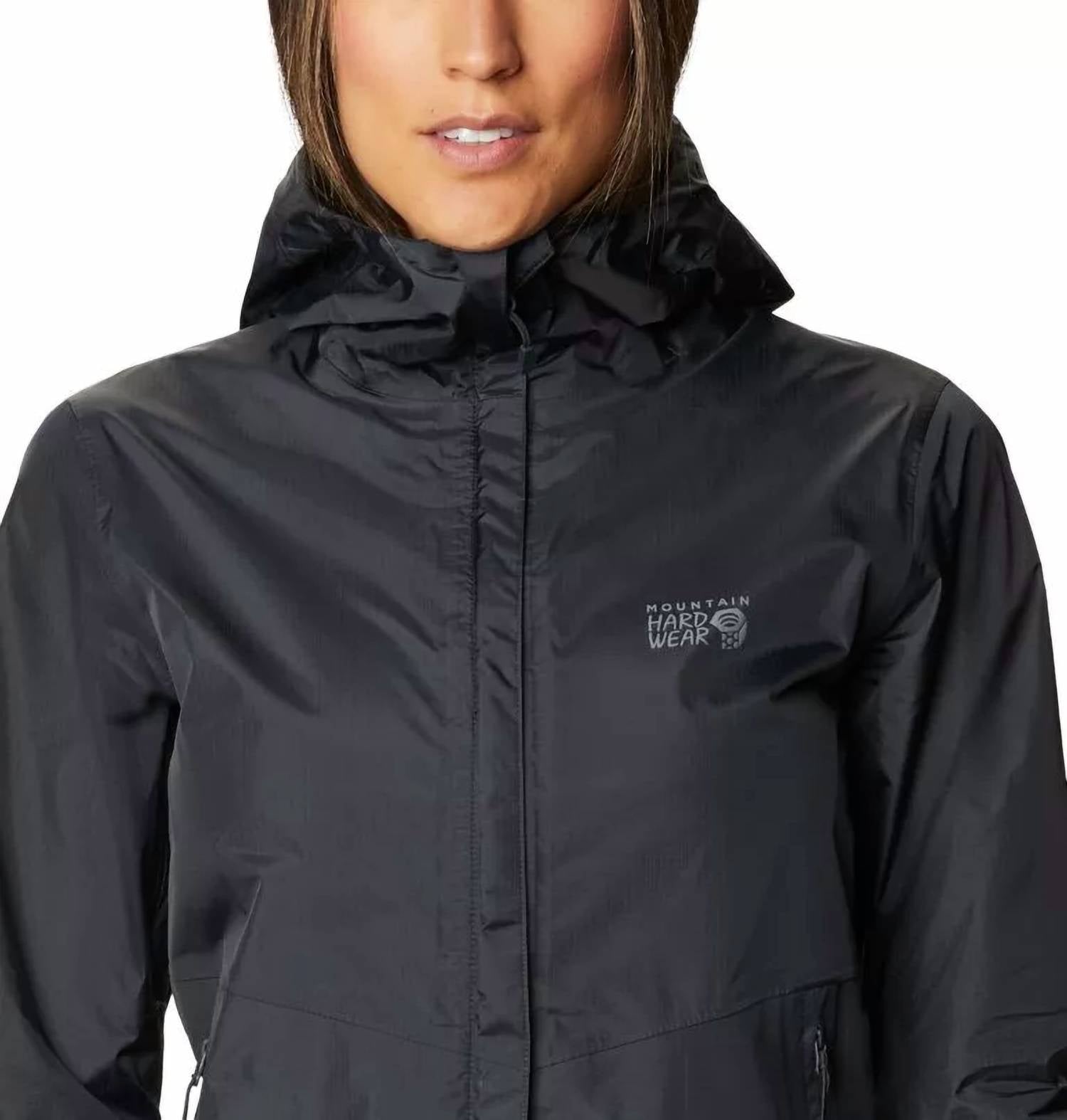 Cute, casual, and comfortable. This jacket is a must have. Introducing the Women's Acadia Hooded Full Zip Jacket by Mountain Hardwear, crafted for both style and function. This versatile piece comes in solid black, featuring long sleeves and a lightweight, 100% recycled nylon shell with a PFC-free DWR finish. At 27.5 inches in length, it includes an adjustable hood, underarm zip vents, and two zippered hand pockets with a stow feature. Closure is secured with a full zip and storm flap, and further adjustable elements like hook-and-loop cuffs and a drawcord hem add to its tailored fit. The jacket is imported and can be machine washed, making it ideal for fall hiking and athleisure activities.