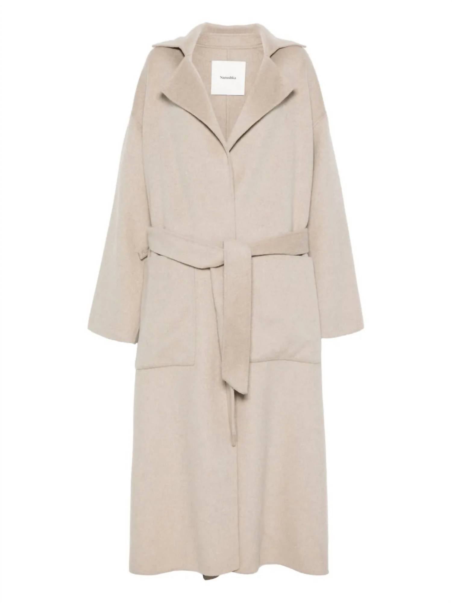 Cute, casual, and comfortable. This jacket is a must have. The Salima Self-tie Belt Coat by Nanushka is a chic addition to your fall wardrobe in a serene stone hue. It features long sleeves and is crafted from a luxurious blend of 90% wool and 10% silk with a 100% viscose lining for ultimate comfort. Designed with a stylish tie closure, this statement piece is imported and crafted to elegantly drape with its scarf-inspired hem. Ideal for women seeking a versatile and timeless coat for travel or the festive Christmas season.