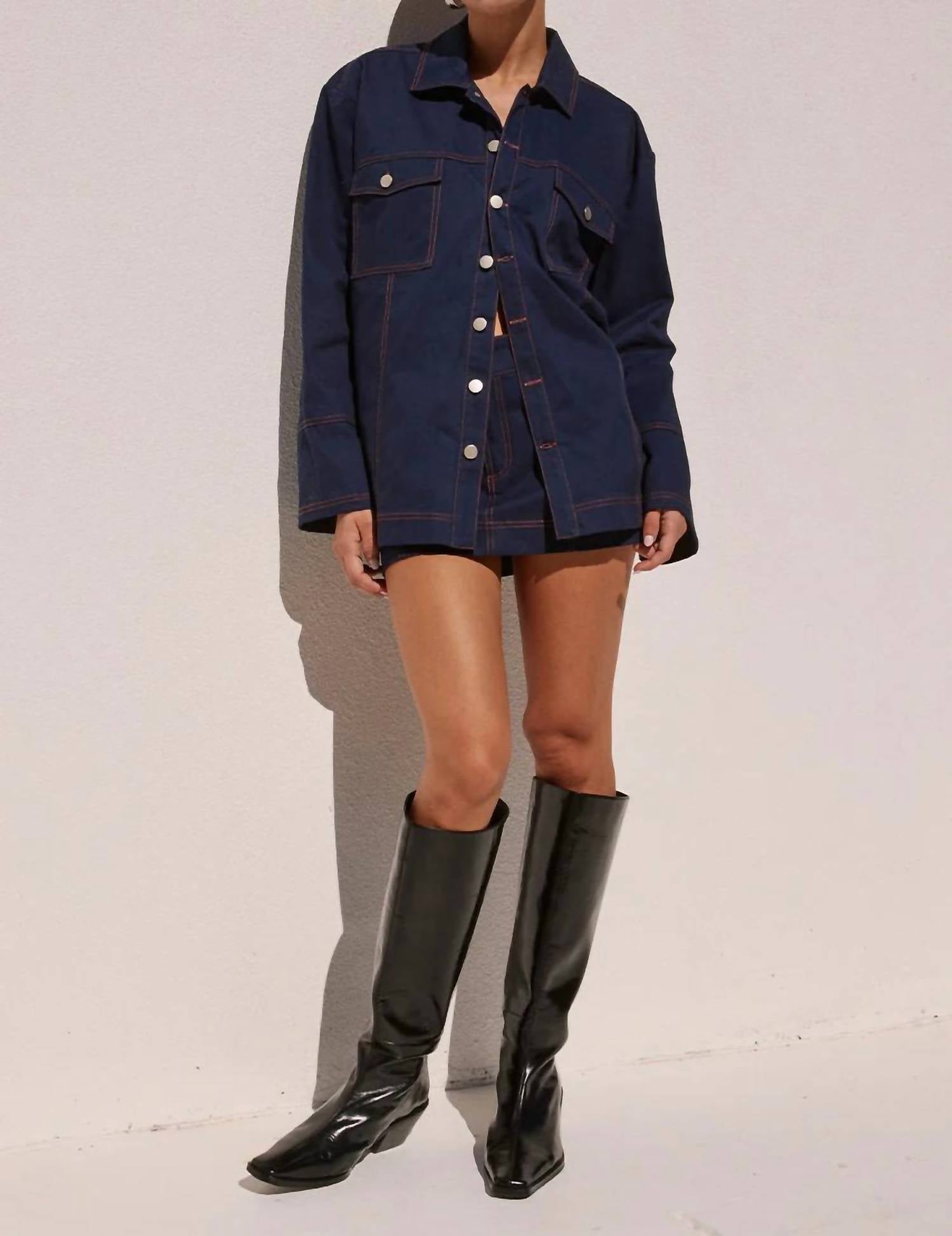A casual yet cool jacket that every closset needs. Enter the realm of understated elegance with the Veronica Jacket by Seven Wonders in deep navy. This women's casual jacket features long sleeves and a solid pattern, crafted from 100% cotton for a non-stretch feel. The oversized fit and collar neckline create a relaxed silhouette, while the button closure pairs seamlessly with your wardrobe. Style it solo or with the Veronica Mini Skirt for an effortlessly chic look this fall.