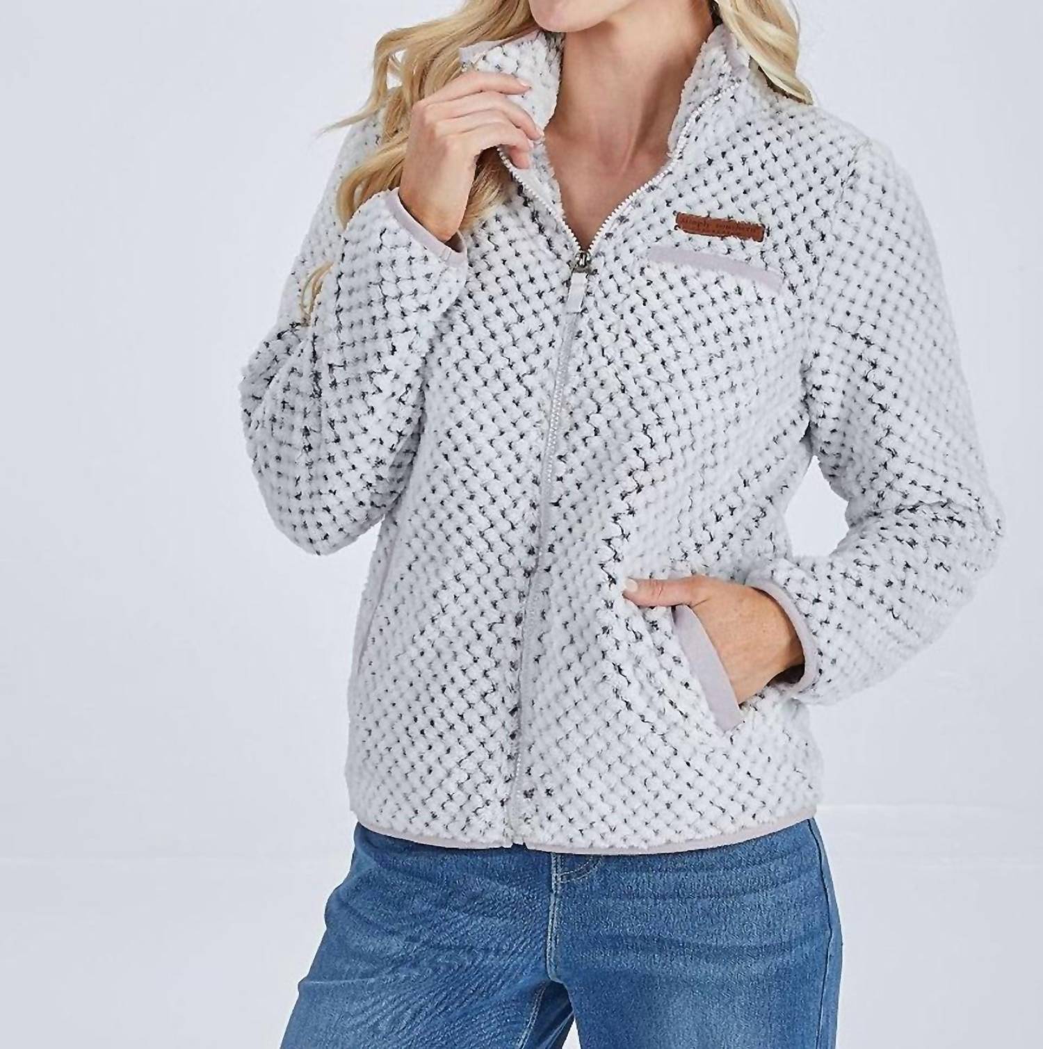 A casual yet cool jacket that every closset needs. Introducing the Youth Soft Full Zip Jacket by Simply Southern, perfect for staying cozy during the crisp fall days. Designed in a textured Frost Gray, this casual jacket features long sleeves and a stylish collar. Made of 100% polyester, it boasts a practical zip closure and convenient pockets, including two side pockets and a chest pocket. Ideal for travel, this streetwear piece is easy to care for with simple hand wash instructions.