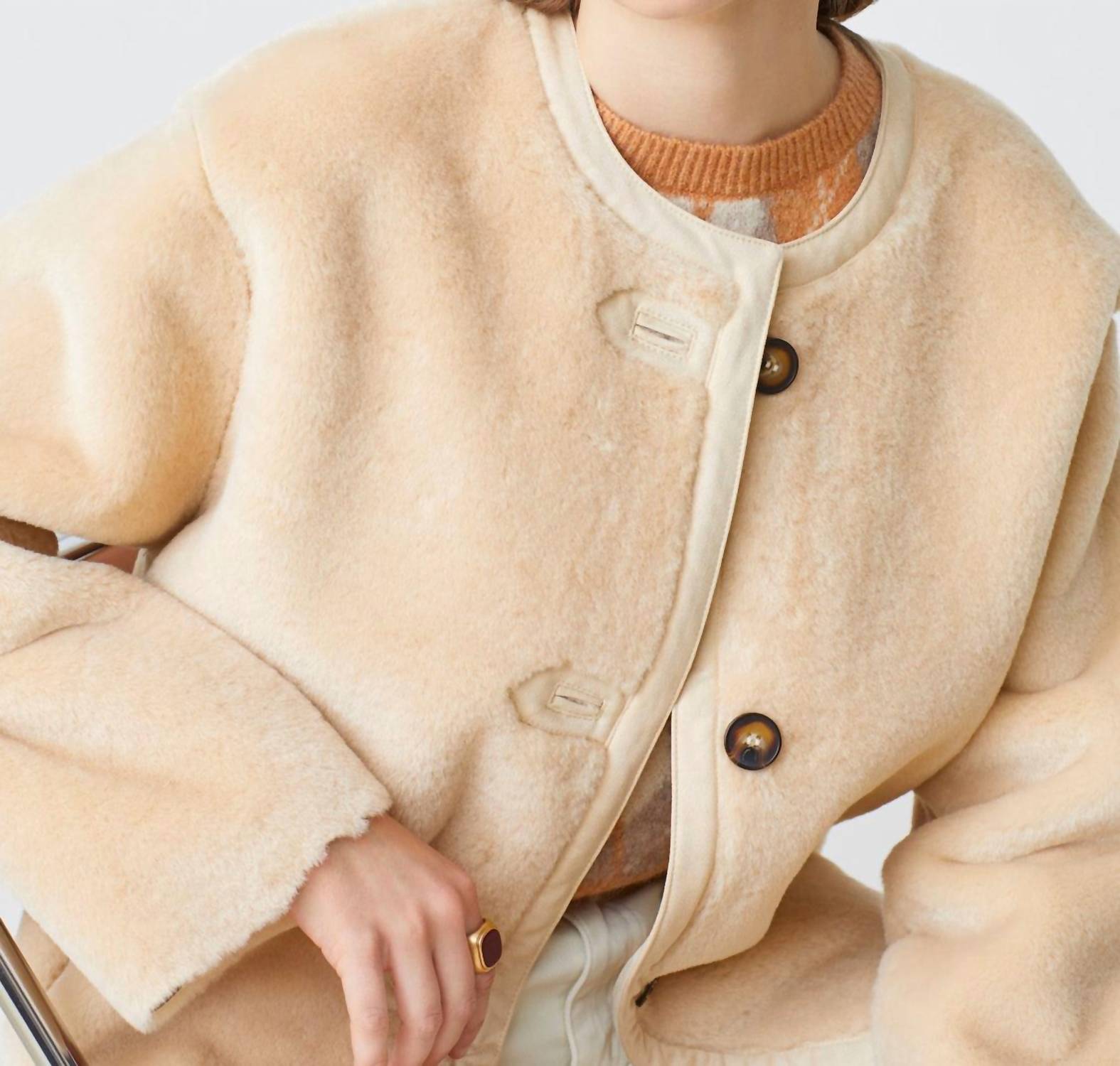 A jacket so versatile you can literally wear it with anything. Elevate your fall wardrobe with the Faux Fur Short Coat by Suncoo, a minimalist piece in a striking cream hue. Tailored with long sleeves and a decadent suede-like interior, this casual jacket offers a warm sheepish exterior crafted from 100% recycled polyester. Designed with a solid pattern and crewneck, it features a button closure for easy wear. To maintain its luxurious texture, dry clean only.
