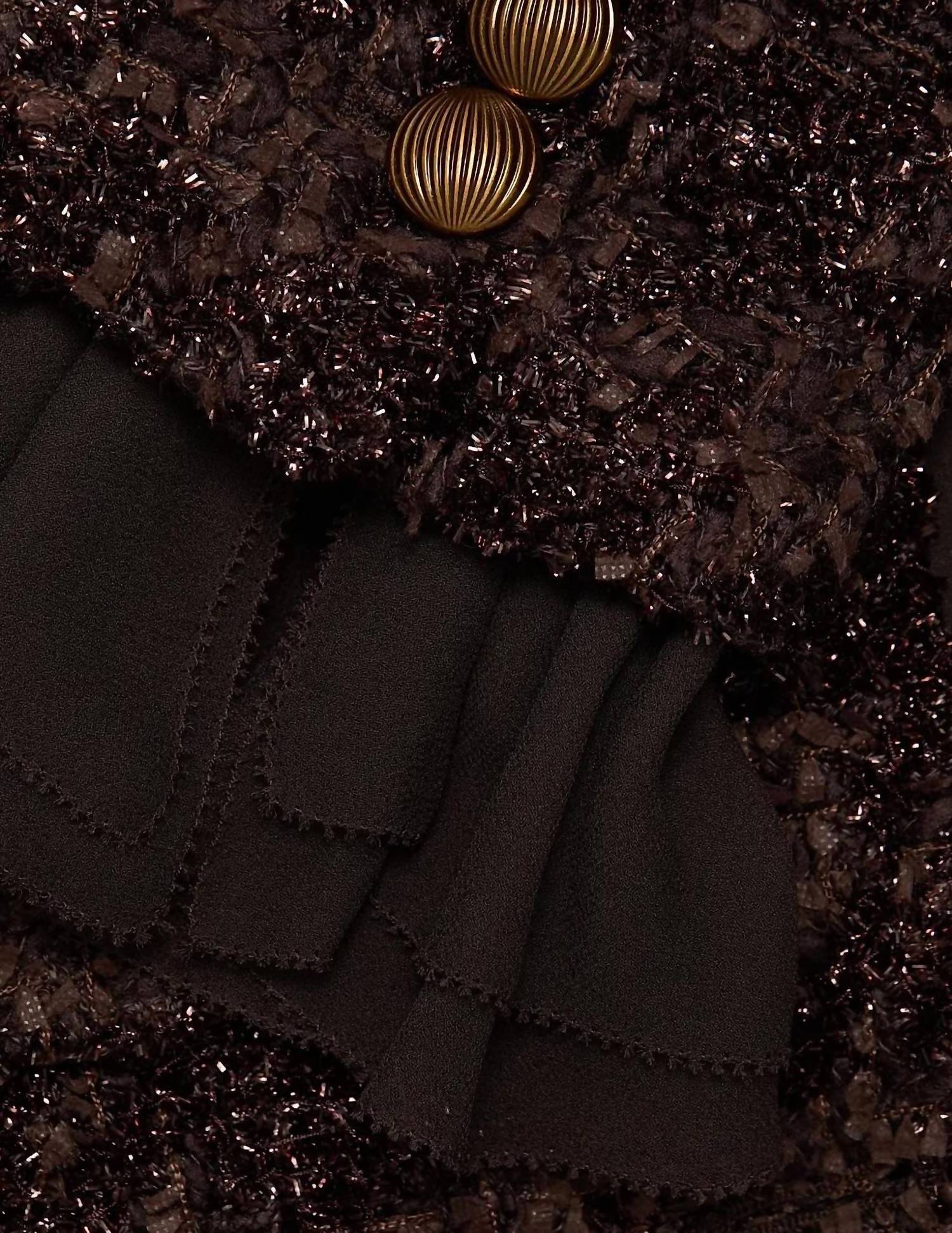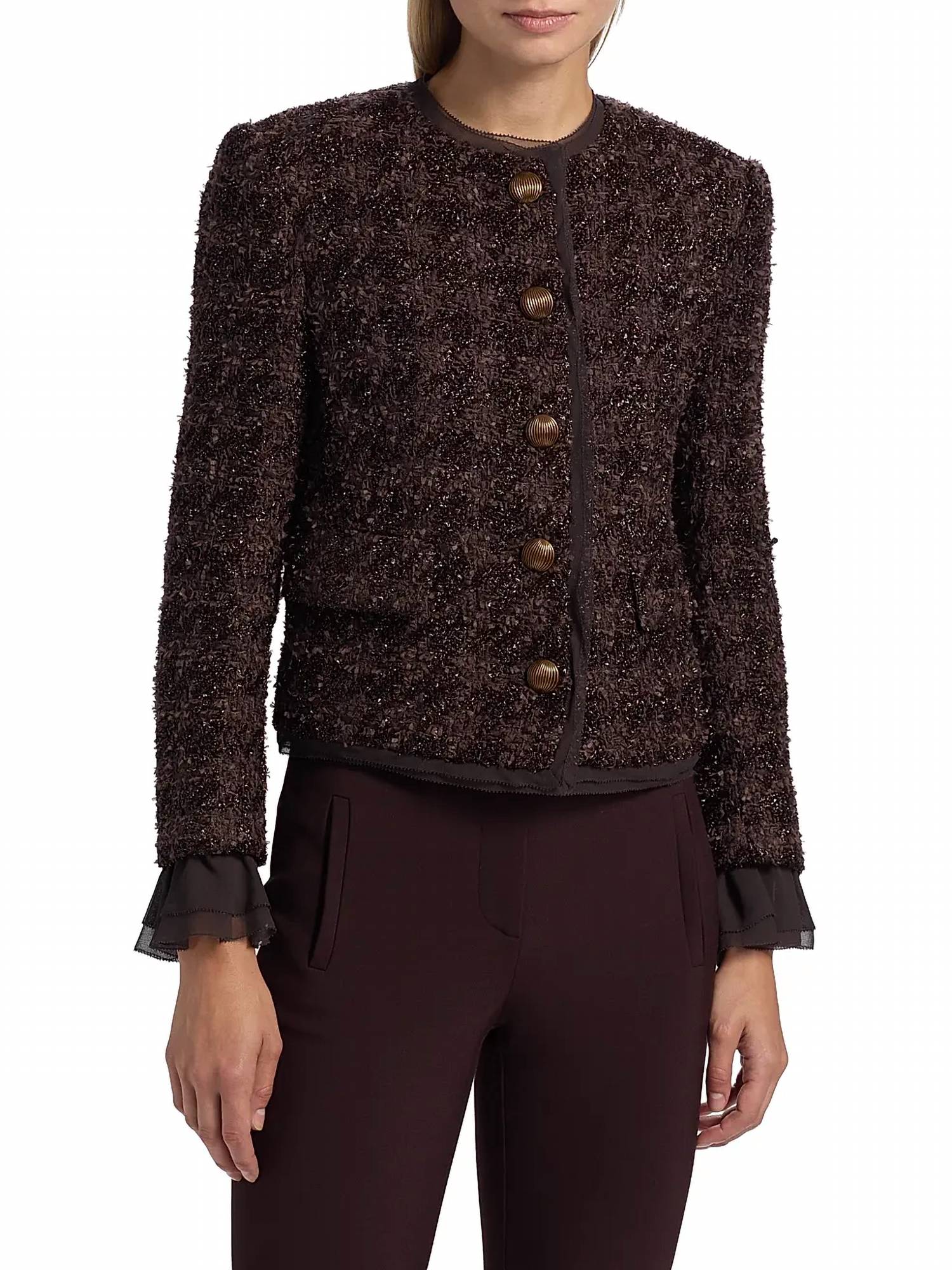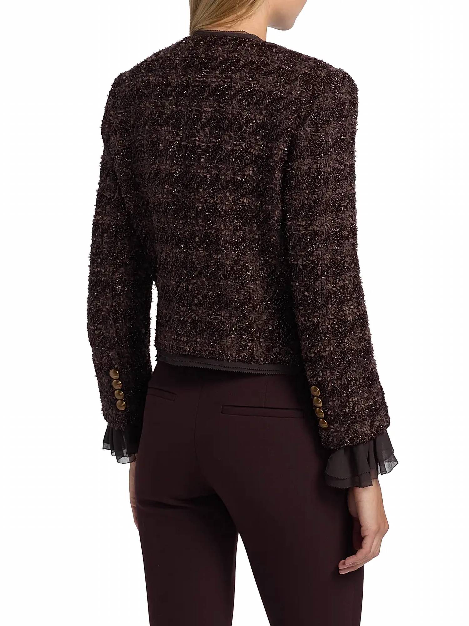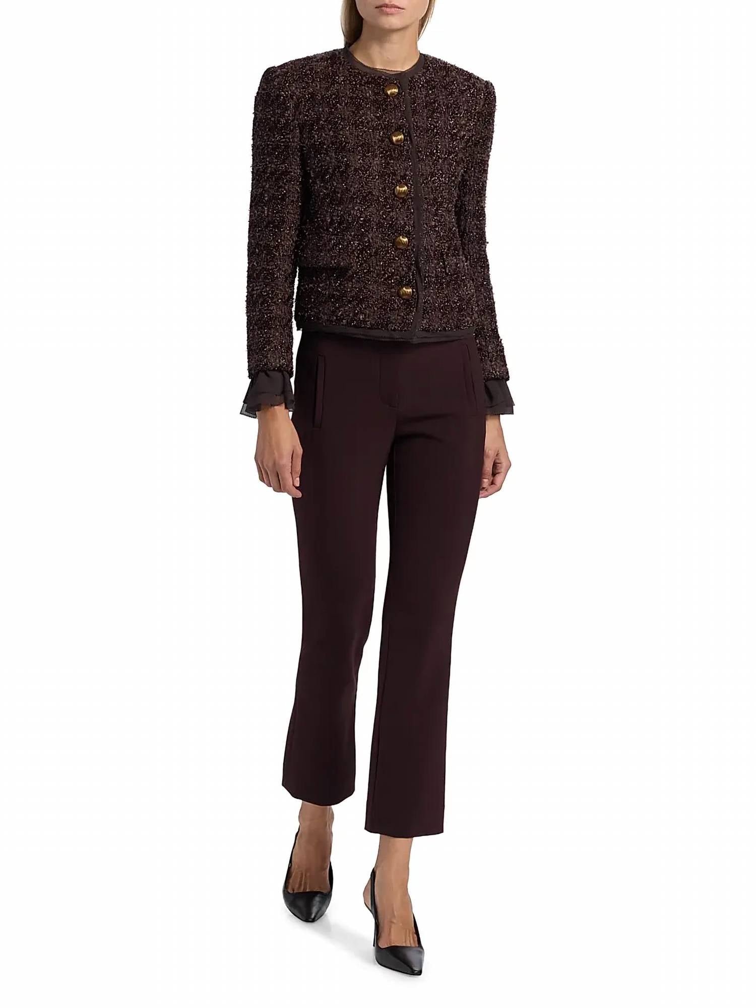 A casual yet cool jacket that every closset needs. Introducing the Veronica Beard Audrina Metallic Tweed Jacket in Dark Currant, a standout piece perfect for the contemporary wardrobe. This women's jacket flaunts long sleeves and a fitted, cropped length of 20.375 inches, crafted from a luxurious blend of 58% Polyamide and 42% Acrylic, with a lining made from 100% Cupro. Its collarless neckline and button closure are complemented by removable peekaboo ruffled cuffs and sheer trim, making it ideal for stylish occasions like dinner parties or New Year's Eve celebrations. Originating from a brand celebrated for understanding feminine tailoring, this jacket should only be dry cleaned to maintain its elegant appeal.