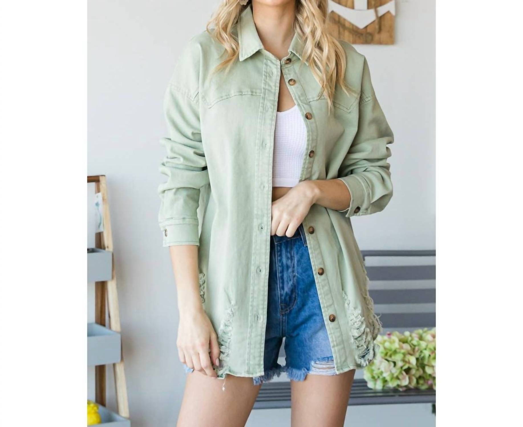 Cute, casual, and comfortable. This jacket is a must have. Introducing the Distressed Button Down Shacket by Veveret, a perfect casual jacket for your Fall wardrobe in taupe with a relaxed fit. Designed with a stylish collar and button closure, this shacket features long sleeves and a unique distressed bottom hem. Crafted from a 97% cotton and 3% spandex blend, it promises both comfort and flexibility. Effortlessly maintain its look with machine washing and tumble drying.