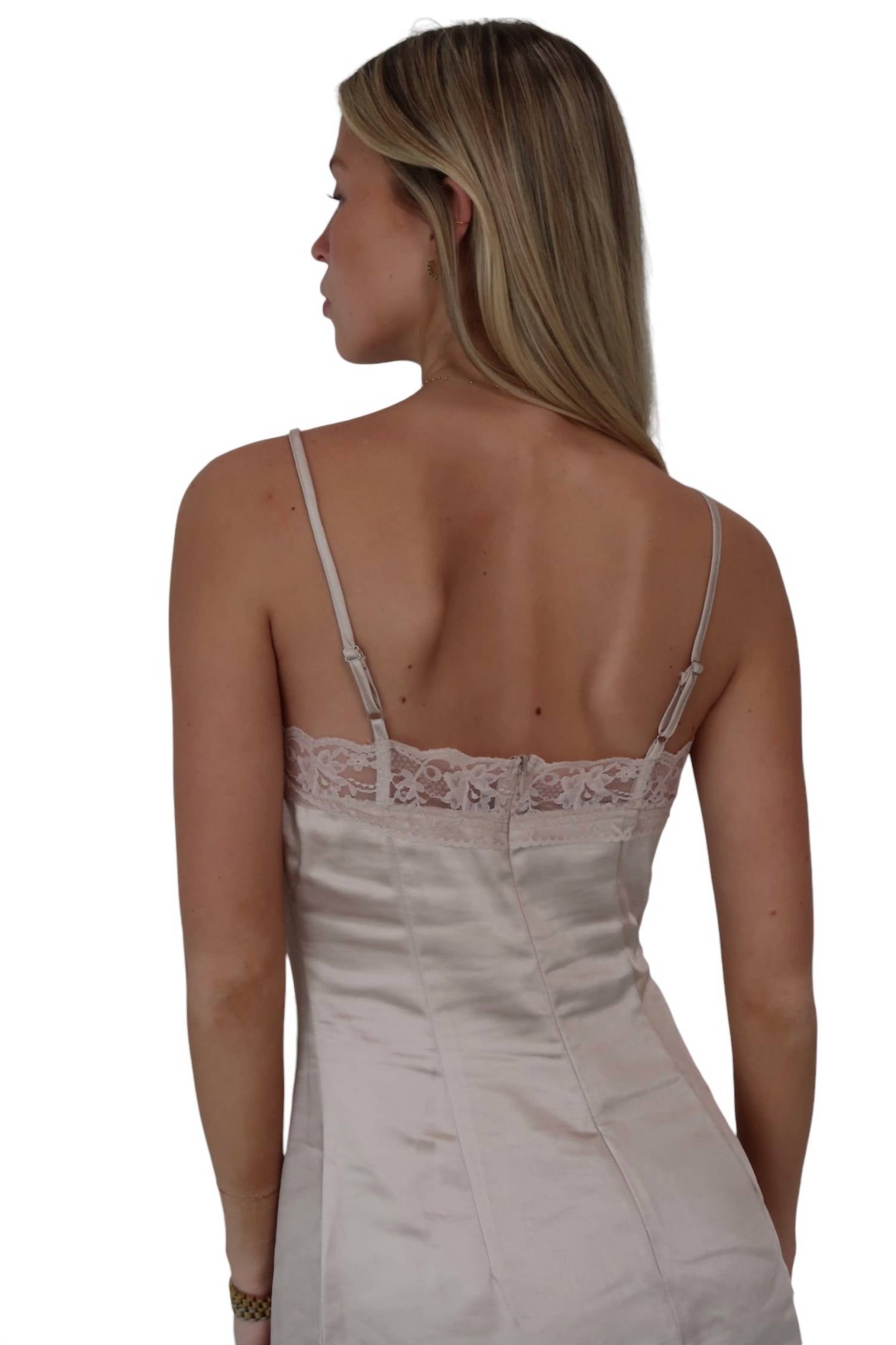 This dress features elegant lace trimming, creating a soft and feminine silhouette. With dainty bow details and adjustable straps, it also includes a back zipper closure for a comfortable fit, making it perfect for various occasions. 100% Polyester. Hand wash cold separately. Do not bleach. Lay flat to dry. Cool iron if needed. Do not dry clean.