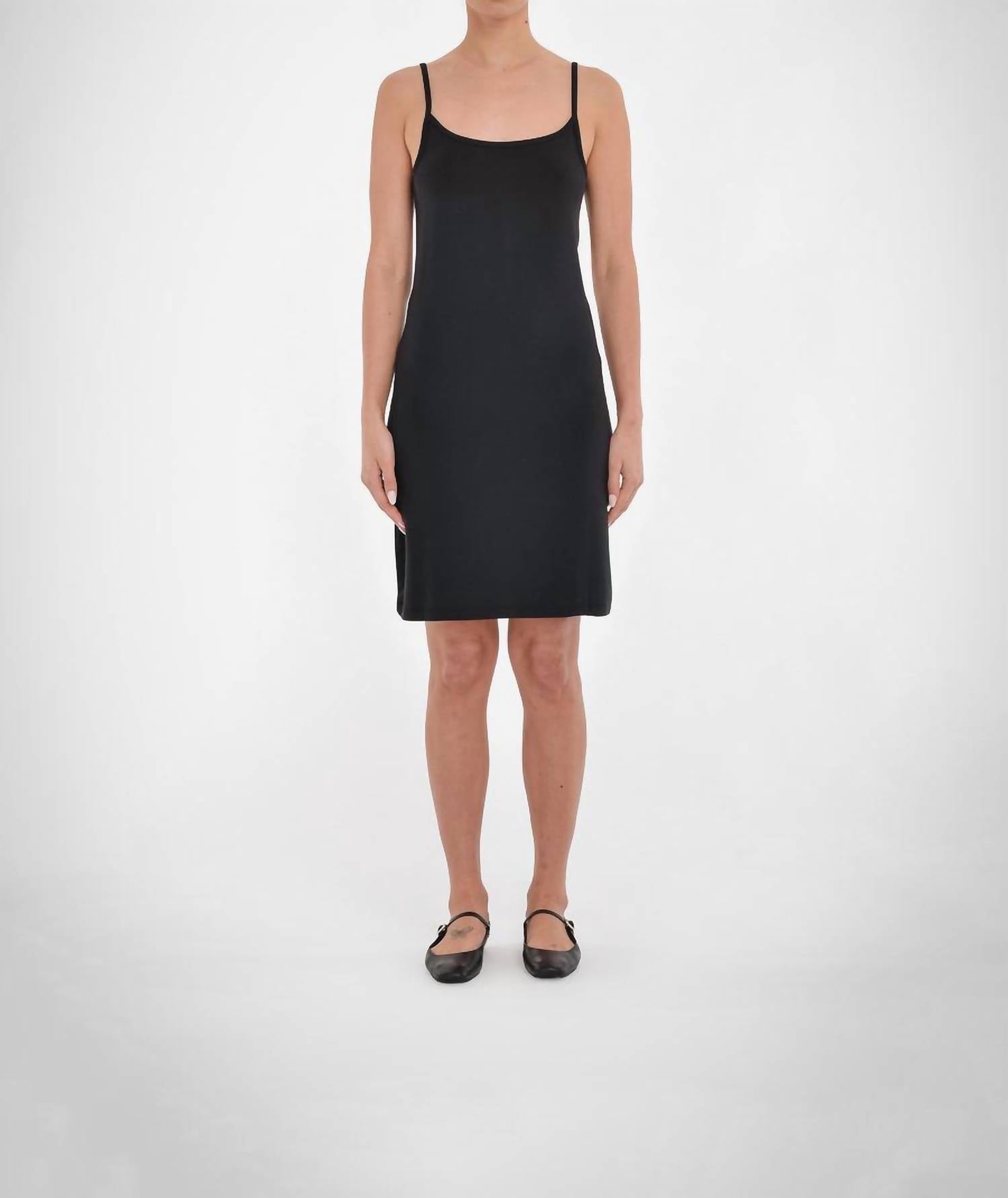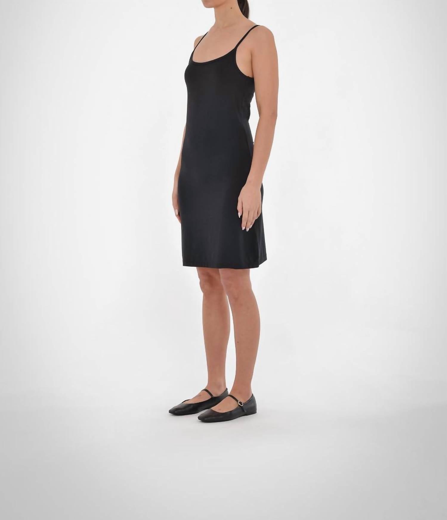Buttery soft mini dress crafted with care. Designed as a slim-fit. Solid black chemise. Lightweight piece is perfect for wearing on its own or layered for added style. Every garment aims to maximize wear and comfort. Experience the narrative of timeless elegance and make this your essential summer pick.