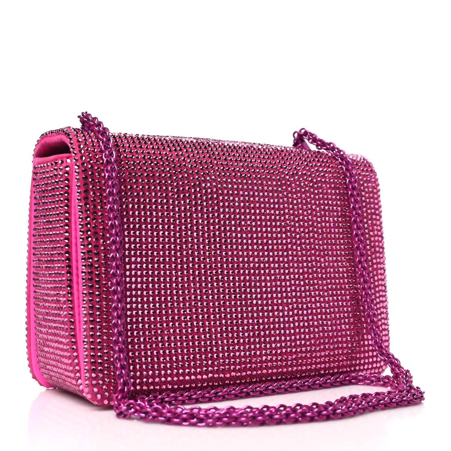 Don't be mistaken by its size, this little bag holds more than you'd expect! Discover the elegant Women's Crystal Suede Embellished Clutch by Valentino Garavani, an exquisite accessory in stylish pink. Crafted from luxurious suede, this clutch is adorned with pink rhinestones and features a striking giant pink pyramid stud on the front flap. With dimensions of 8.00 inches in length, 5.25 inches in height, and 1.25 inches in width, it offers refined elegance and functionality. The dark pink chain shoulder strap offers a drop of both 10.00 and 21.00 inches, and the interior boasts partitioned suede leather with convenient pockets for effortless organization.