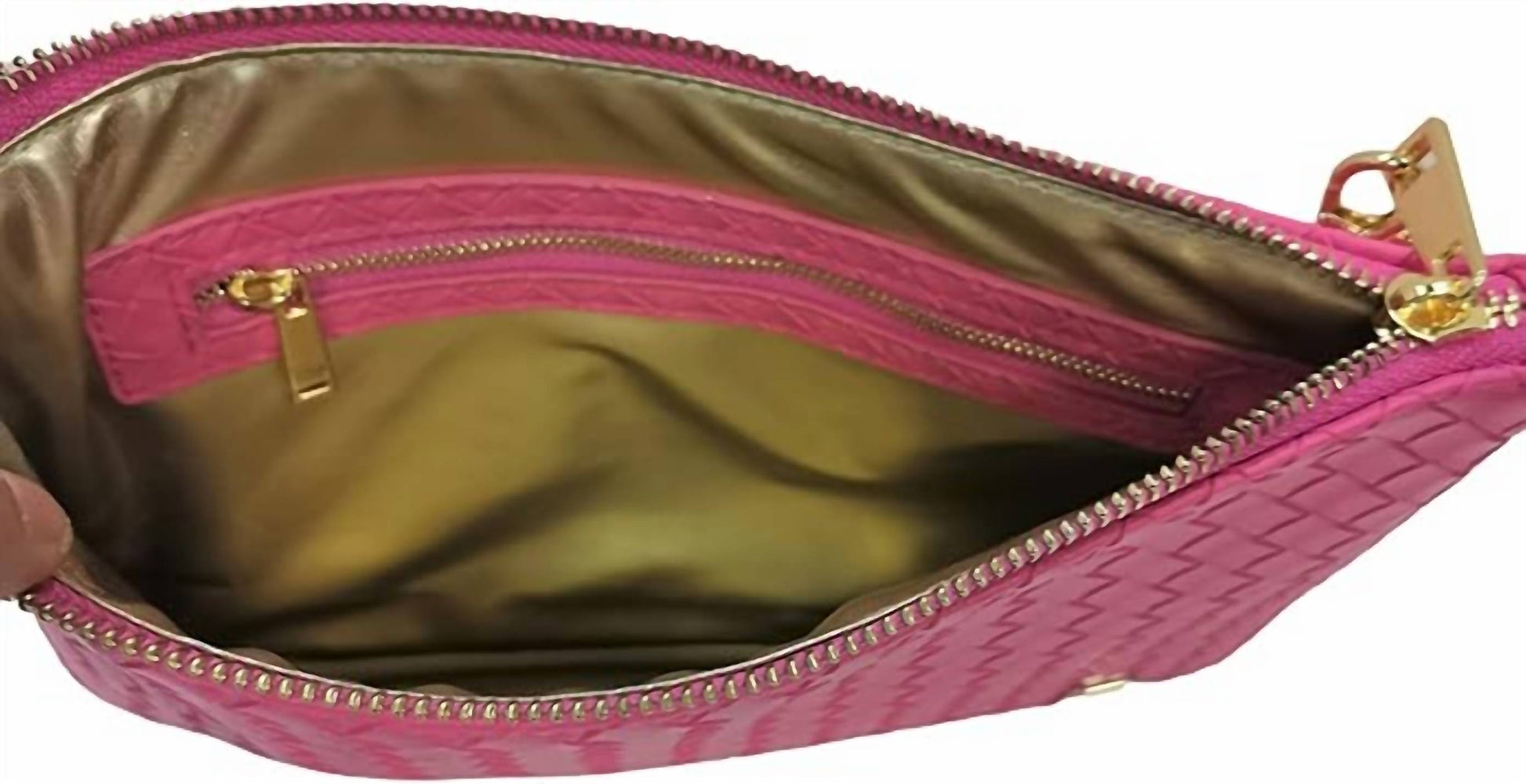 Lipstick, check. Mints, check. Credit card, check. The cutest little bag that holds all of your necessities. Discover the Women's Luxe Go-go Wristlet by TRVL Design, crafted for sophistication in a striking Dahlia color. This chic wristlet features a soft woven vegan PU leather exterior, complemented by elegant gold hardware and a luxe gold interior. It is designed with a zipper closure and includes a removable wristlet strap, offering versatile use as a clutch or a convenient pouch for essentials. Its multi-functional design includes an inside zip pocket, measuring 9.75"l x 7"h x .25"d, and is water-resistant and wipeable, making it both stylish and practical.