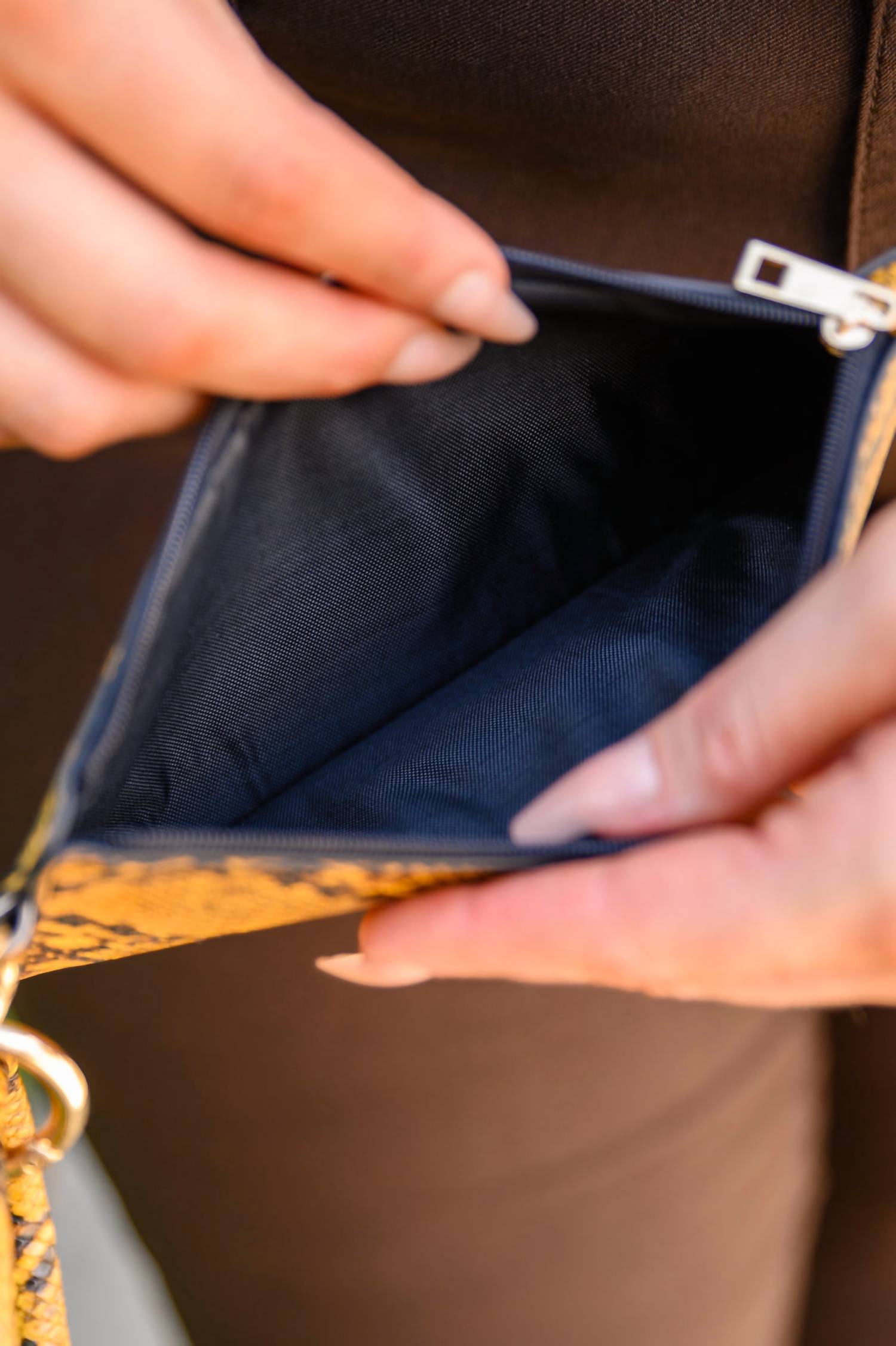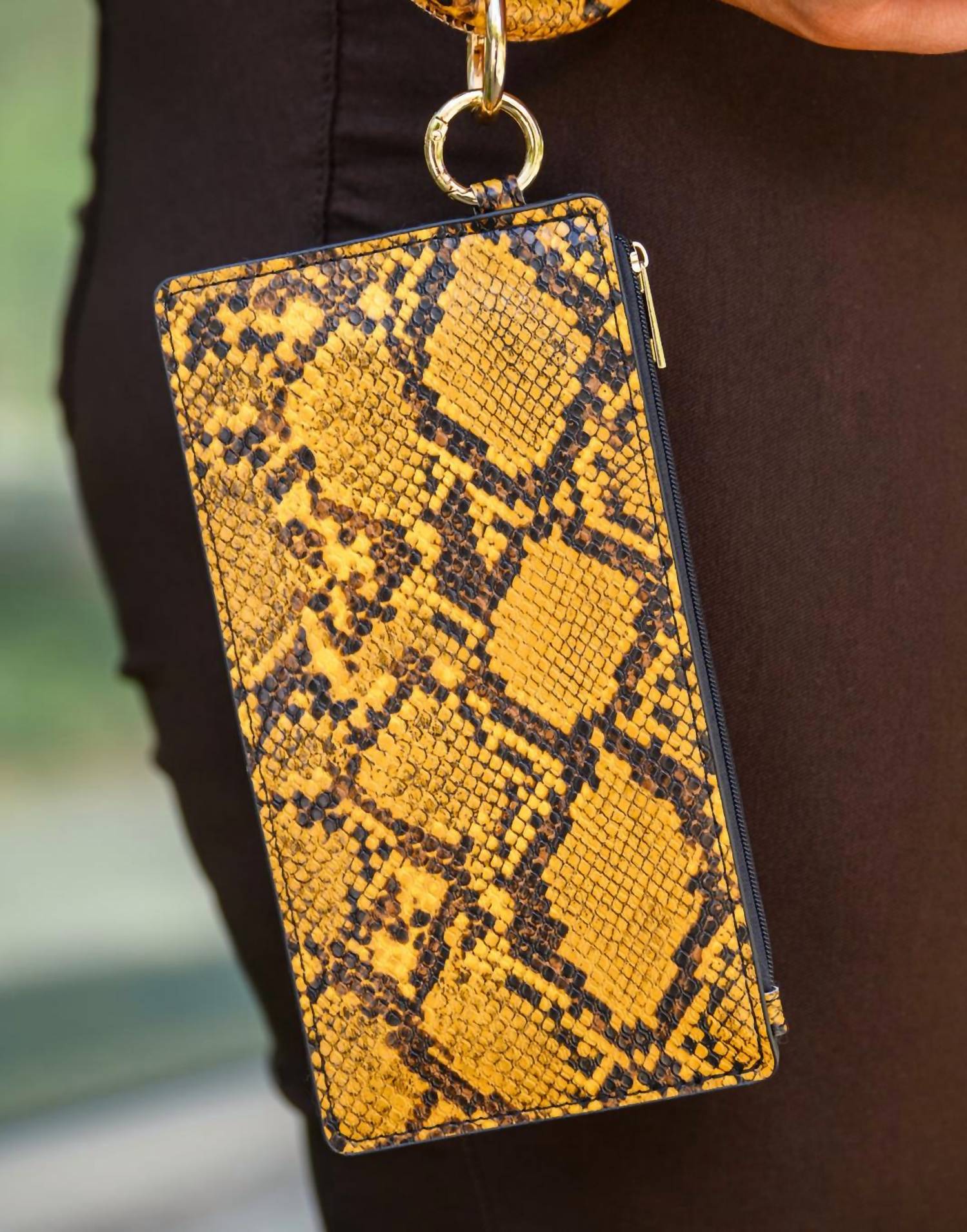 Lipstick, check. Mints, check. Credit card, check. The cutest little bag that holds all of your necessities. Introducing the Women's Clear Break Snakeskin Clutch by 123 Amore, an eye-catching accessory that elevates any outfit with its vibrant yellow faux snakeskin design. This clutch, measuring approximately 8 inches in length and 4 inches in width, features a practical zipper closure and a key ring with a wrist holder for easy carrying. Made from durable faux leather, it's the ideal size for holding all your night-out essentials.