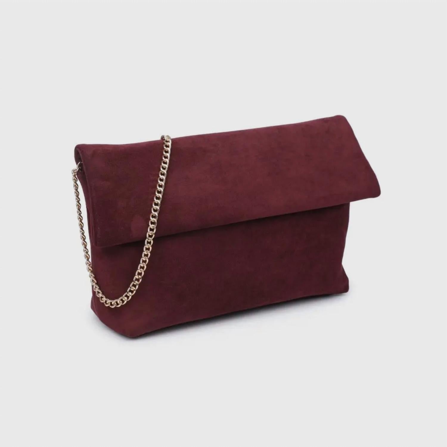 Lipstick, check. Mints, check. Credit card, check. The cutest little bag that holds all of your necessities. The Angela Clutch Bag by Moda Luxe is an exquisite statement piece in a luxurious wine color. Crafted from genuine suede, this bag offers a foldover silhouette with a detachable chain strap for versatile styling. Exterior features include an envelope shape, gold hardware, and a hidden back zipper pocket, while the interior is fabric lined with one zipper pocket and one slip pocket. Dimensions are 12.6 inches in width, 3.5 inches in depth, and 10.2 inches in height.