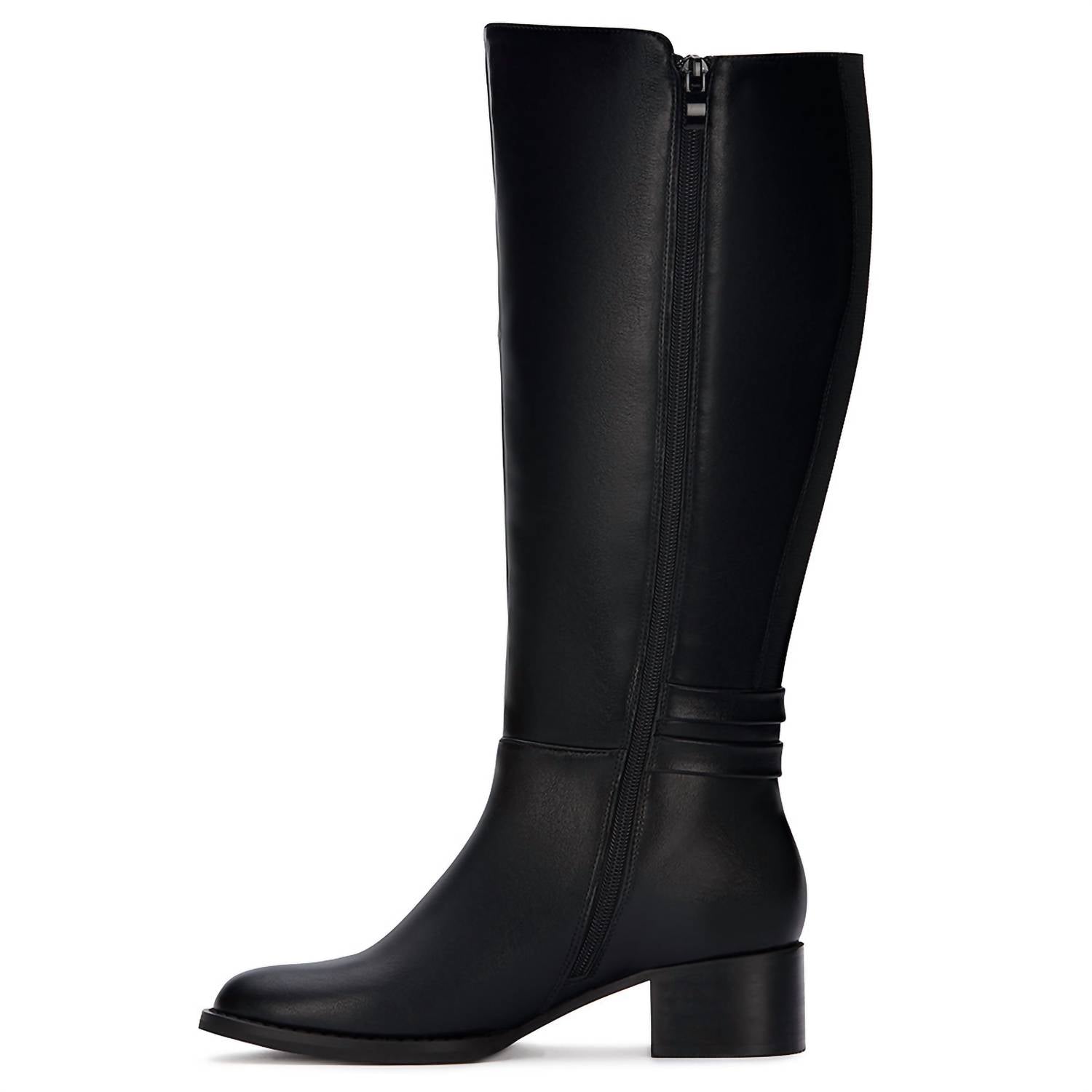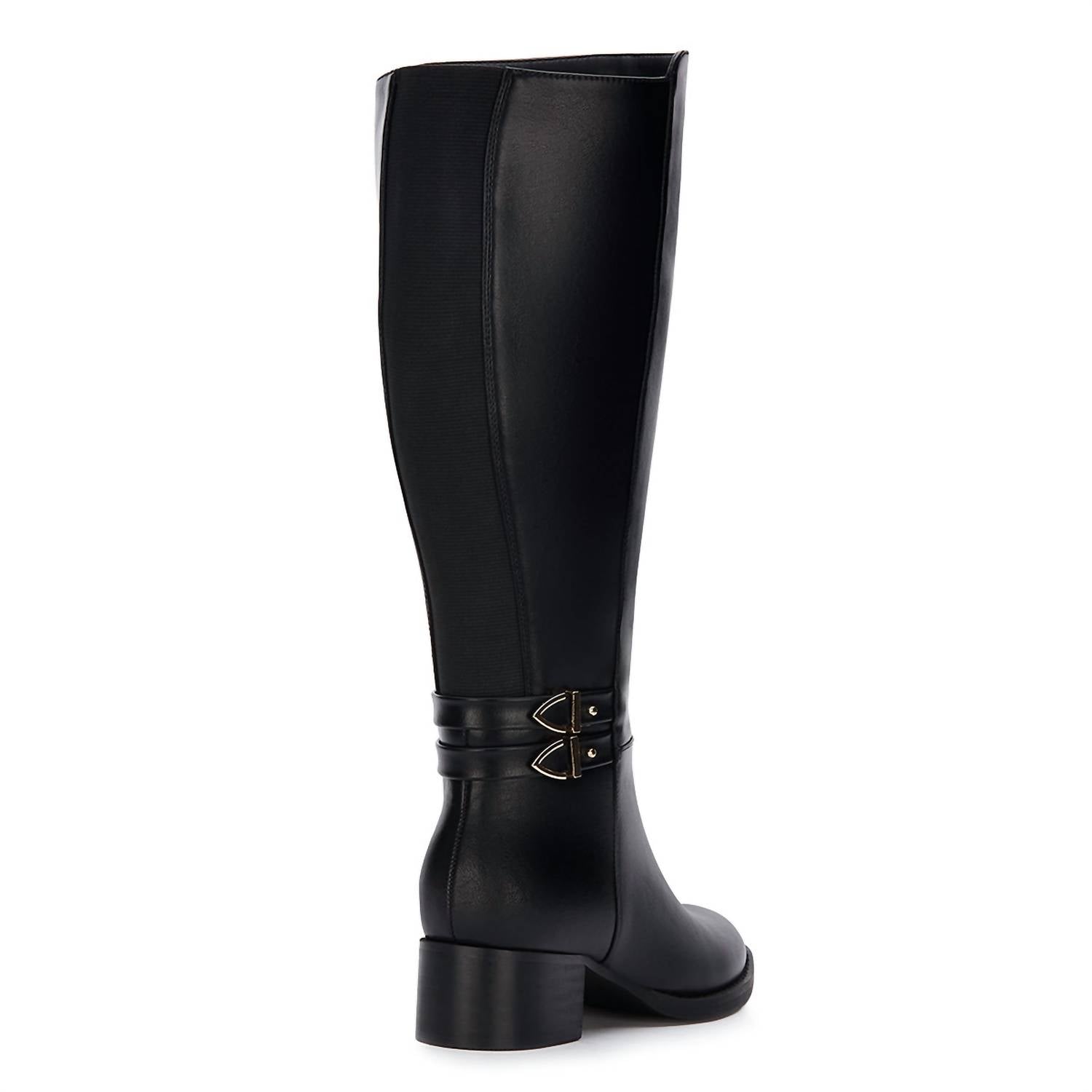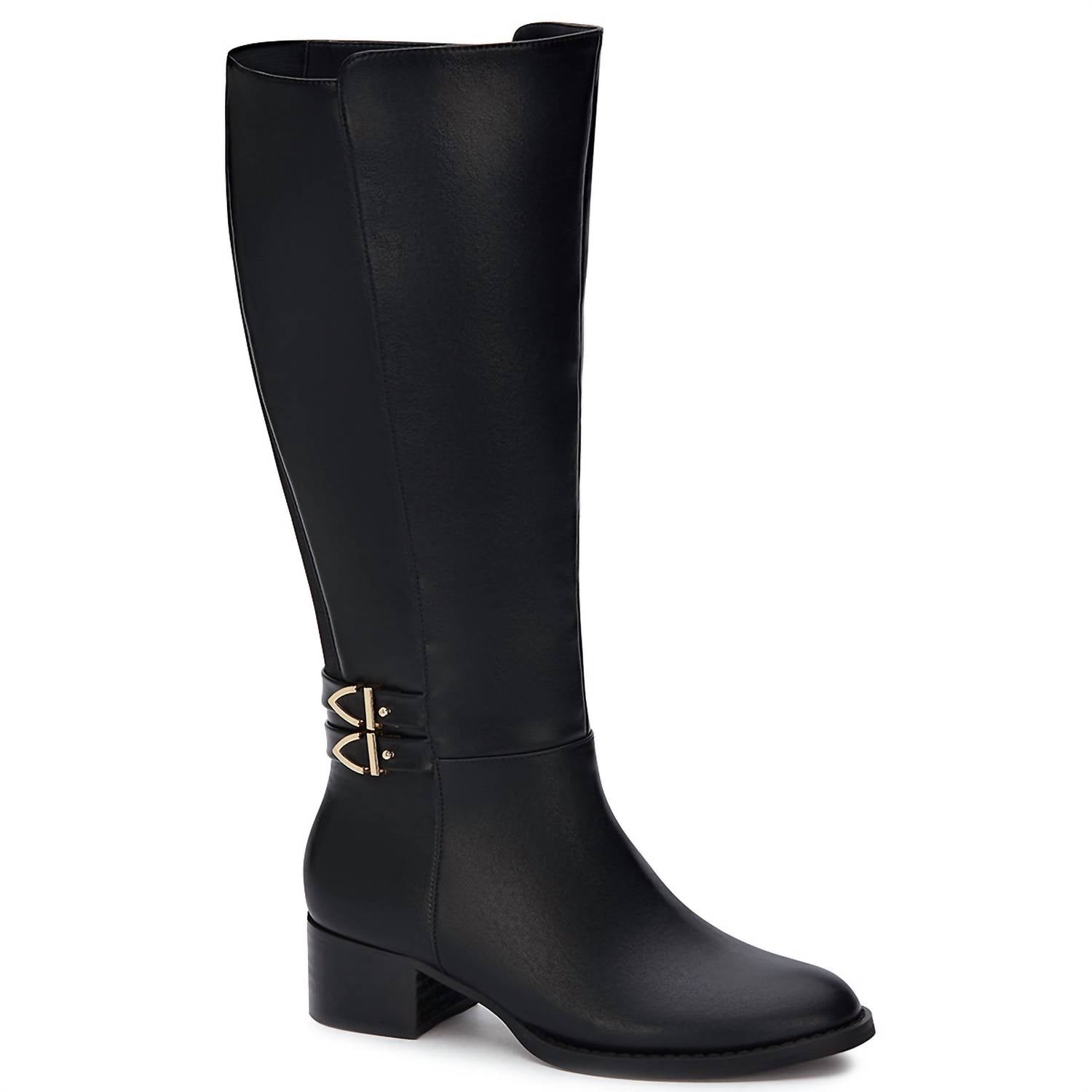 This Tall Riding Boot features a 1.5” block heel, almond toe, and strap and buckle ornament. Crafted from durable nylon with an elastic shaft and side zipper for easy fit, it offers all-day comfort with a padded insole.