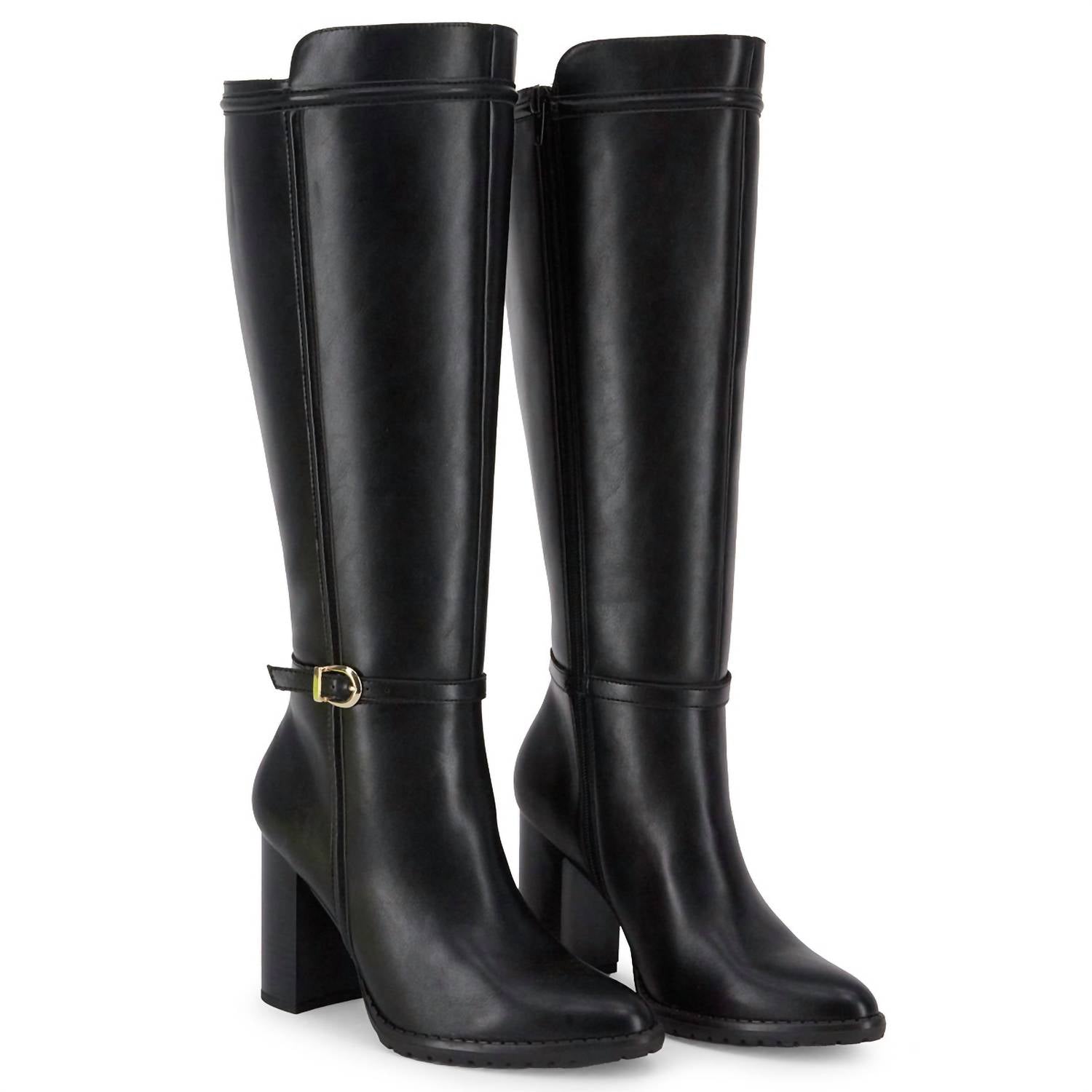 This Tall Riding Boot is crafted from nylon, featuring a 3.94-inch block heel, strap and buckle ornaments, and a side zipper for a secure fit. Elegant and practical, they elevate any outfit with style and confidence.