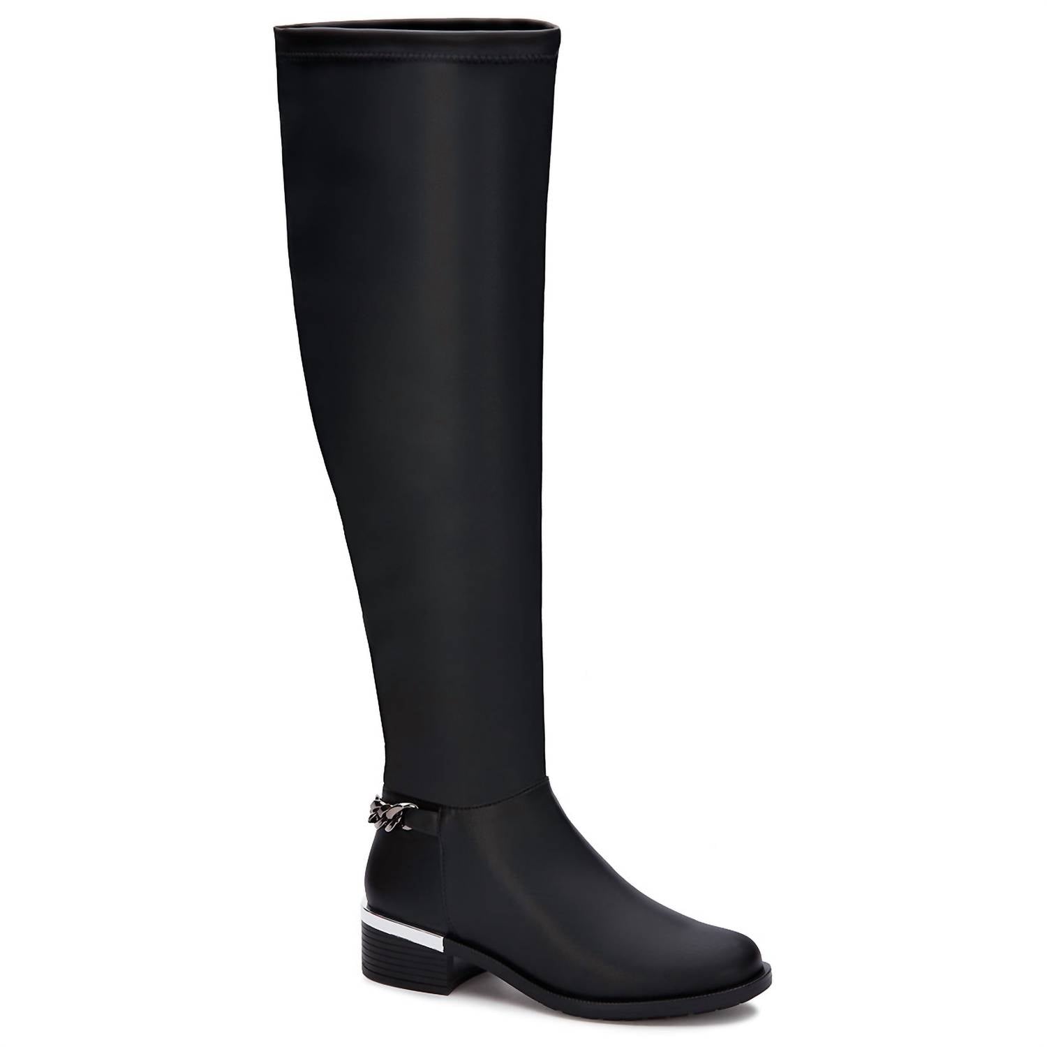 This Tall Riding Boot features a chain and silver insert ornament, a 1.5” block heel, and almond toe. Made with a nylon stretch shaft and side zipper for easy wear, it offers both style and comfort.