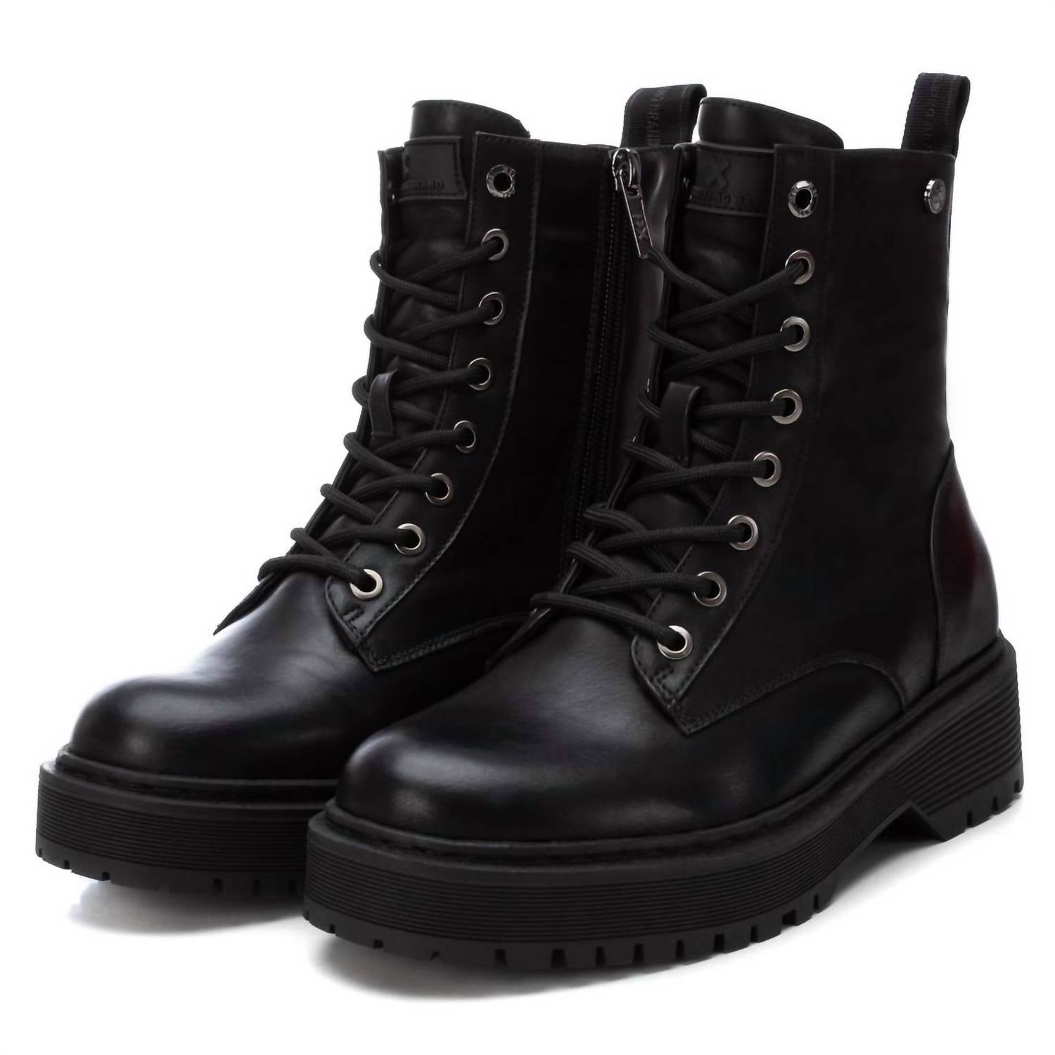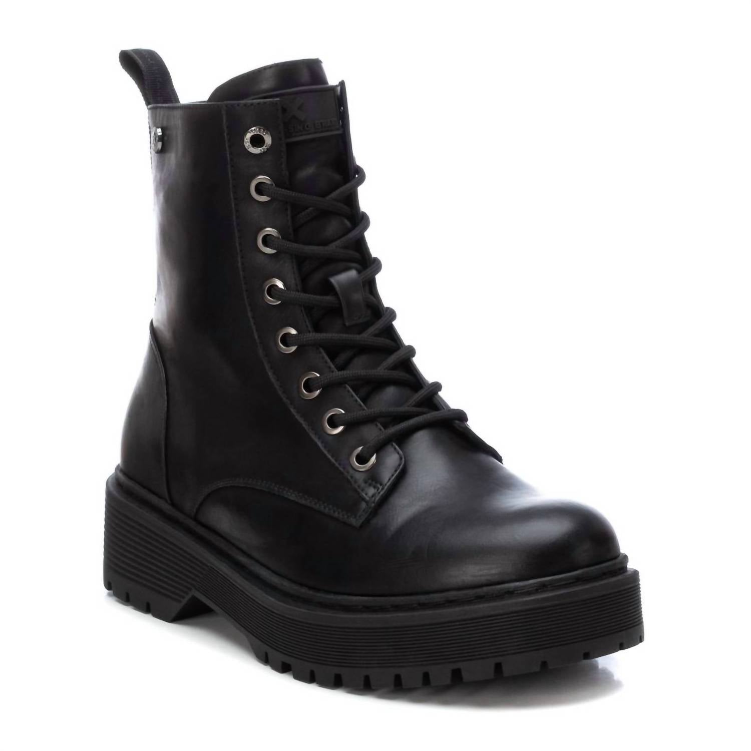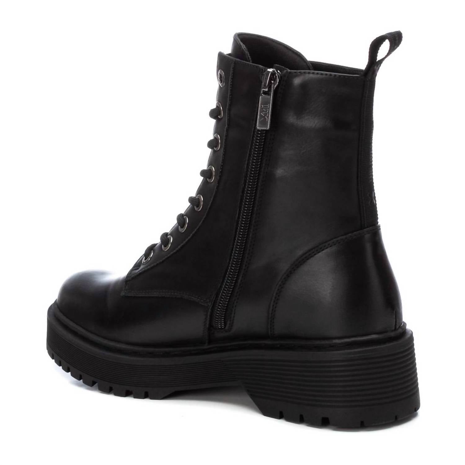 The moto boot trend is here to stay and we especially love this style. Experience the perfect blend of style and comfort with Xti's Women's Combat Booties in black faux leather. These booties feature a convenient side zipper and lace-up closure, and they're designed with a lightweight, non-slip rubber sole for stability. Boasting a padded insole and breathable material, they offer all-day comfort. With a low 1.0 inch block heel and a classic round toe, these booties are a versatile addition to any wardrobe.