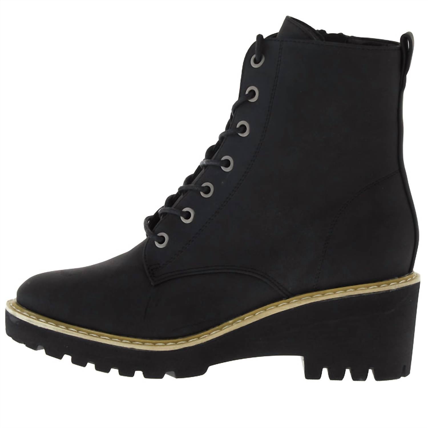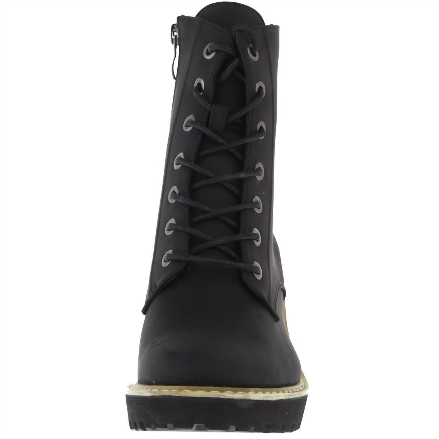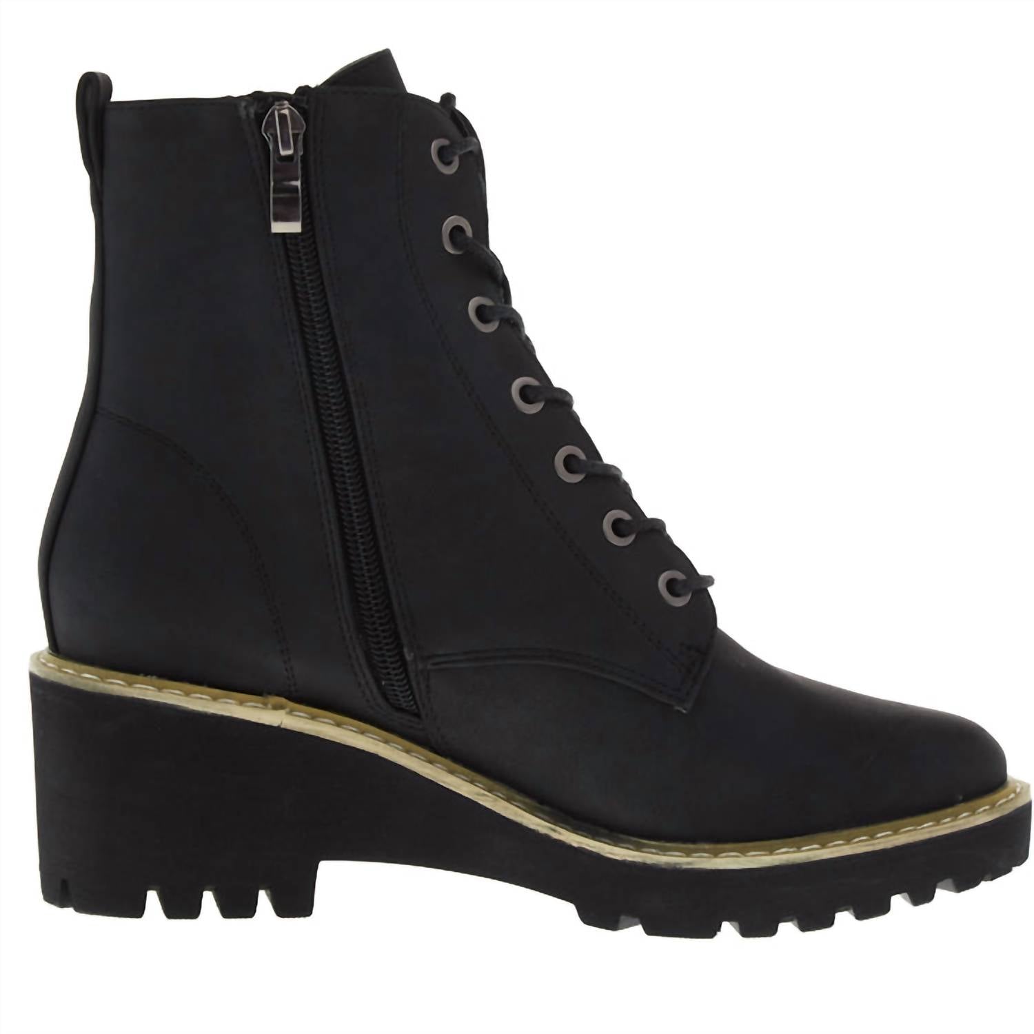 So versatile, you can wear these boots with your favorite jeans or even a dress for a more feminine feel. Step into style with the Women's Ghosted Boots by Corkys Footwear, a perfect blend of femininity and rugged charm. These black combat boots feature a 2.5" wedge cone heel and a 5" shaft designed for urban adventures. With a convenient inside zipper closure, they ensure ease of wear, while the cushioned insole provides all-day comfort. Suitable for travel and minimalist fall trends, these round-toe boots are ideal for New Year's Eve outings.