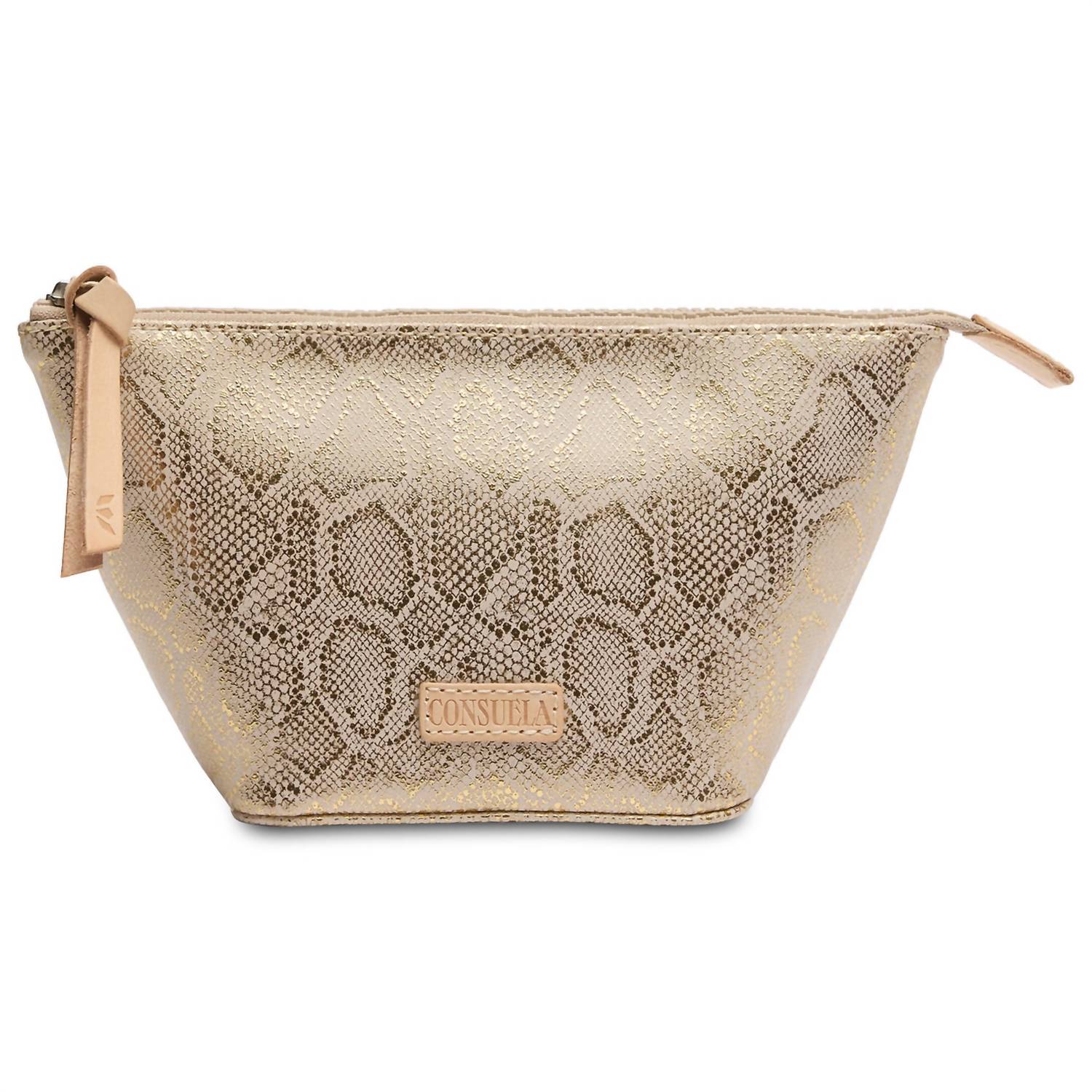 The perfect makeup bag for all your essentials. Discover the Women's Leah Medium Tool Kit by Consuela, designed to accommodate cosmetics, tech gear, art supplies, and more. Crafted with a metallic Leah exterior and a vinyl interior for effortless cleanup, this case features a Diego natural leather zipper pull and logo accent. With dimensions of 7 ¼” (W) x 4 ½” (H) x 2 ¾” (D), it offers a generous opening and spacious interiors for all your essentials. Proudly made in Mexico, pattern placement may vary.